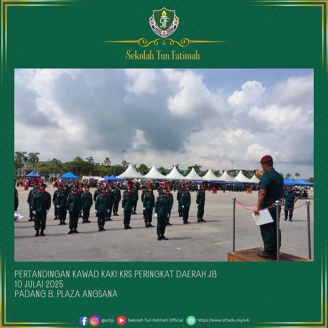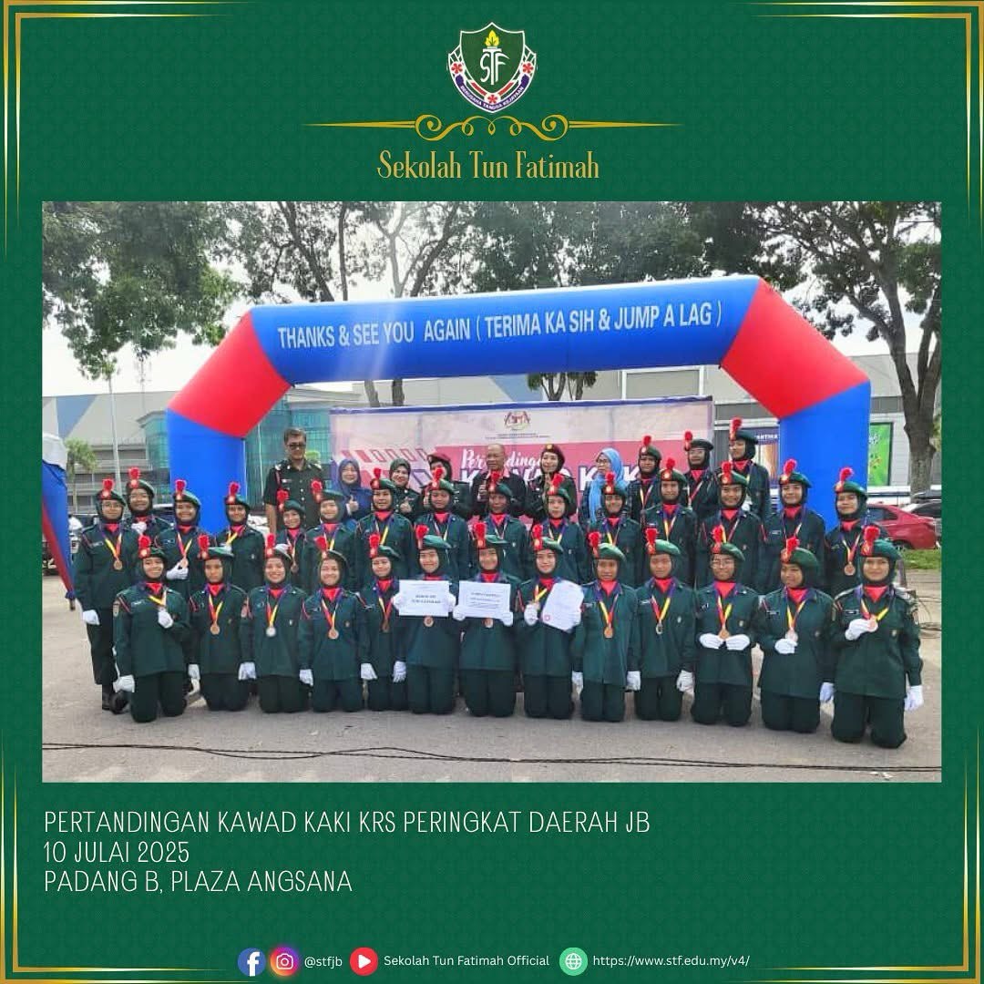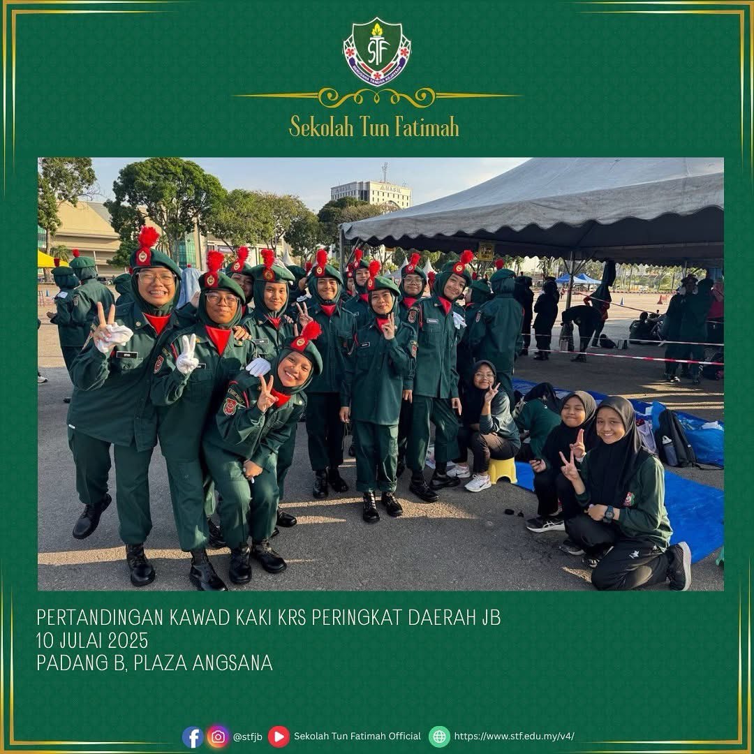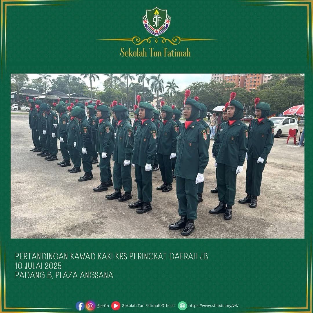 Tahniah dan syabas pasukan KRS Sekolah Tun Fatimah! Seramai 35 orang murid Tingkatan 1 hingga Tingkatan 4 telah mewakili sekolah dalam Pertandingan Kawad Kaki KRS Peringkat Daerah Johor Bahru.