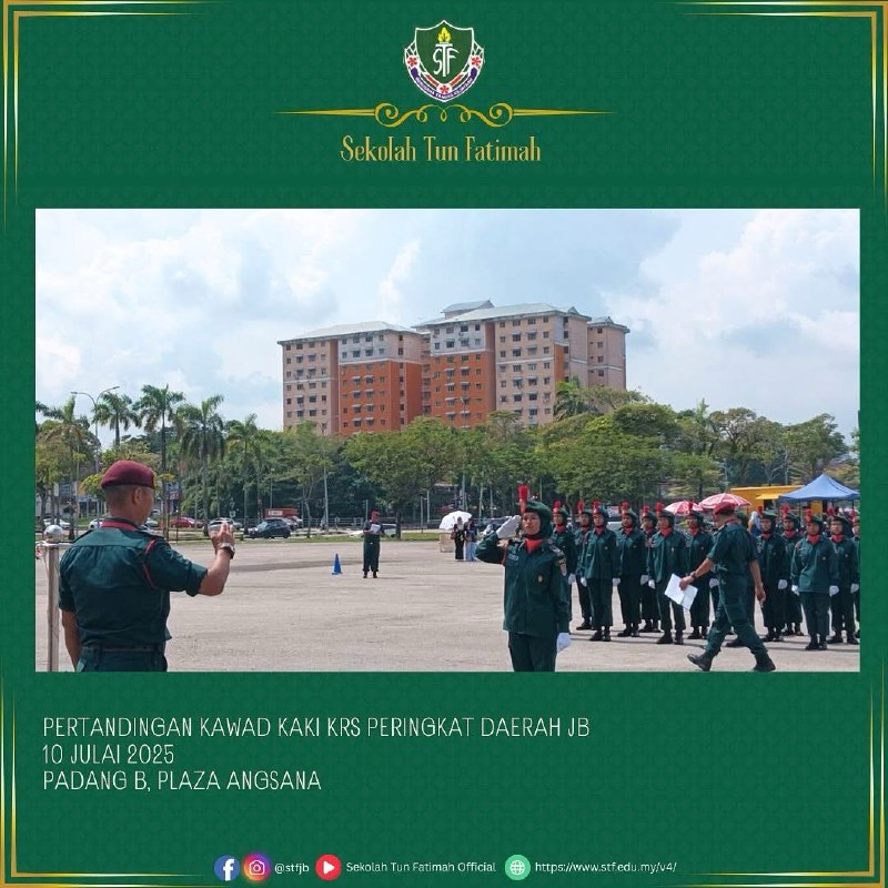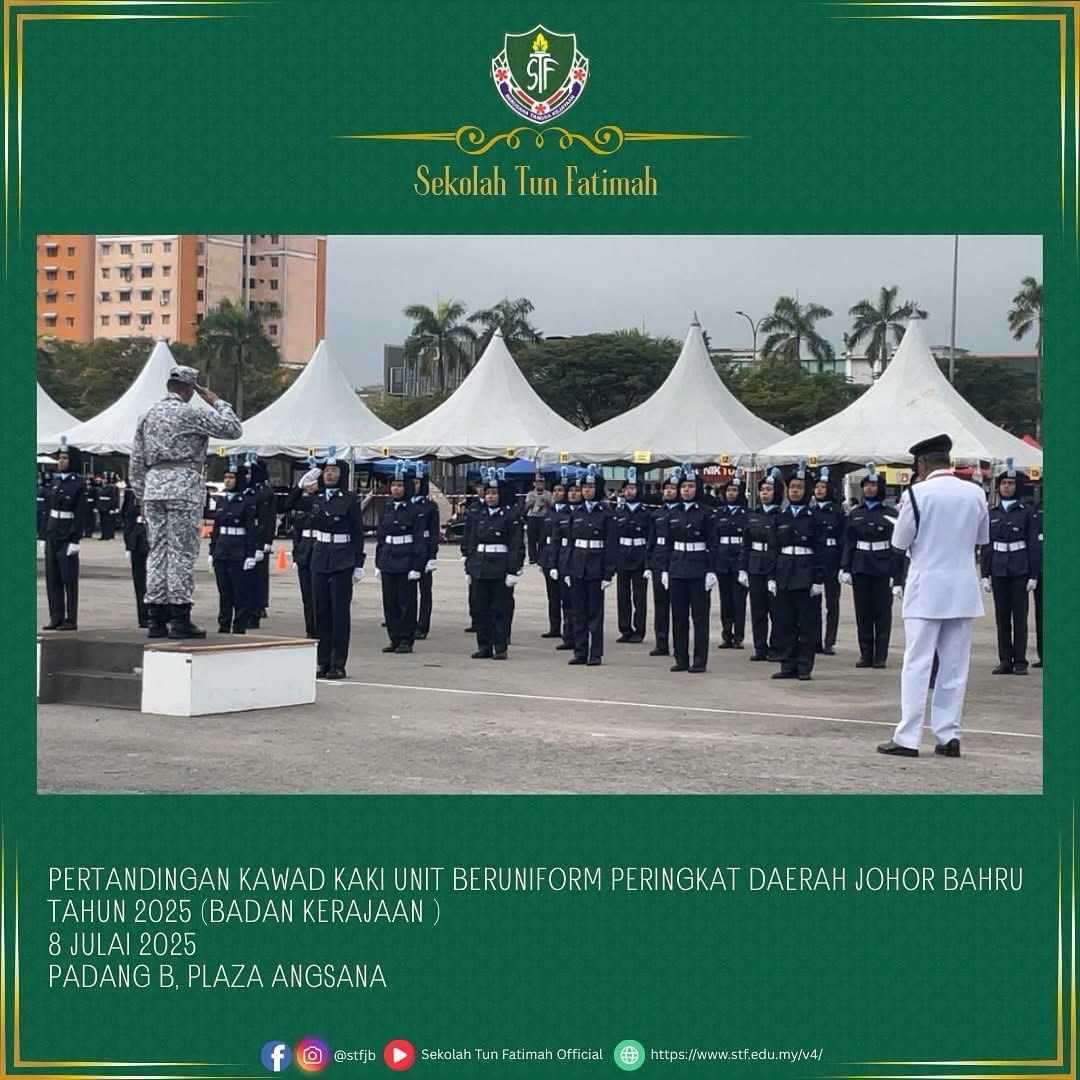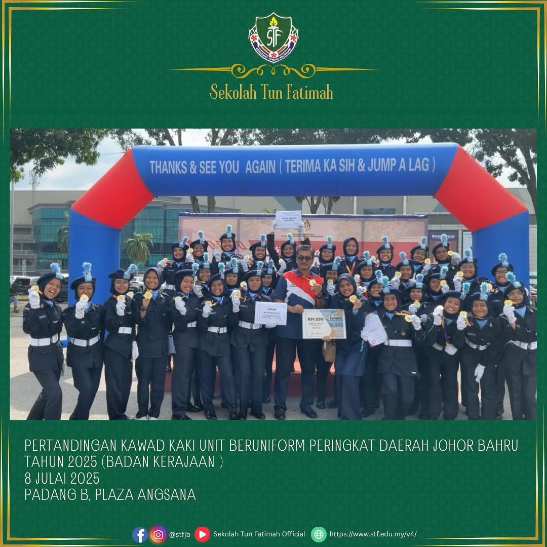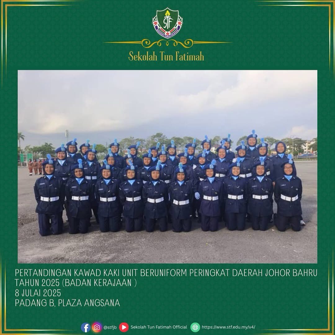 Tahniah dan syabas pasukan KRS Sekolah Tun Fatimah! Seramai 35 orang murid Tingkatan 1 hingga Tingkatan 4 telah mewakili sekolah dalam Pertandingan Kawad Kaki KRS Peringkat Daerah Johor Bahru.