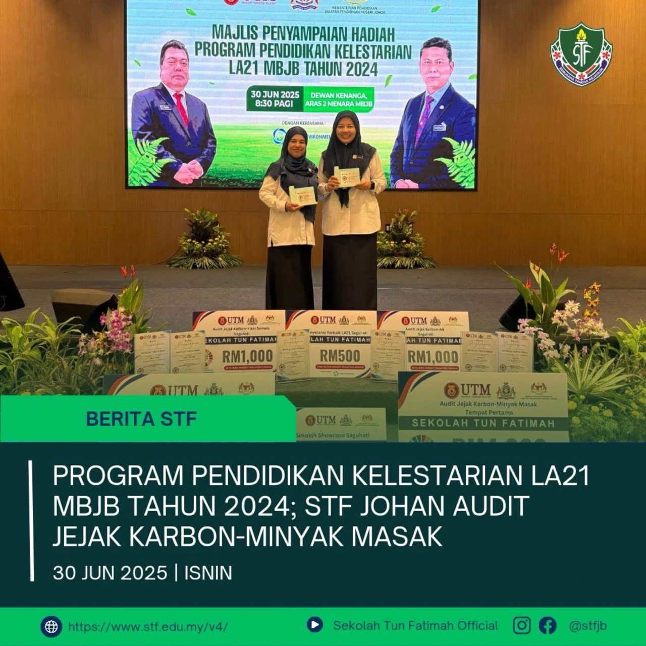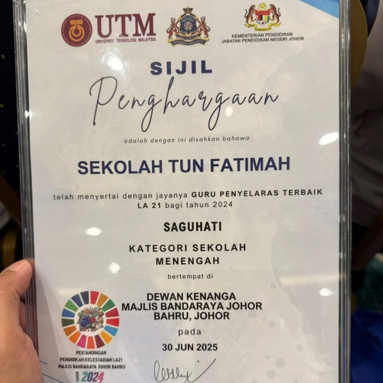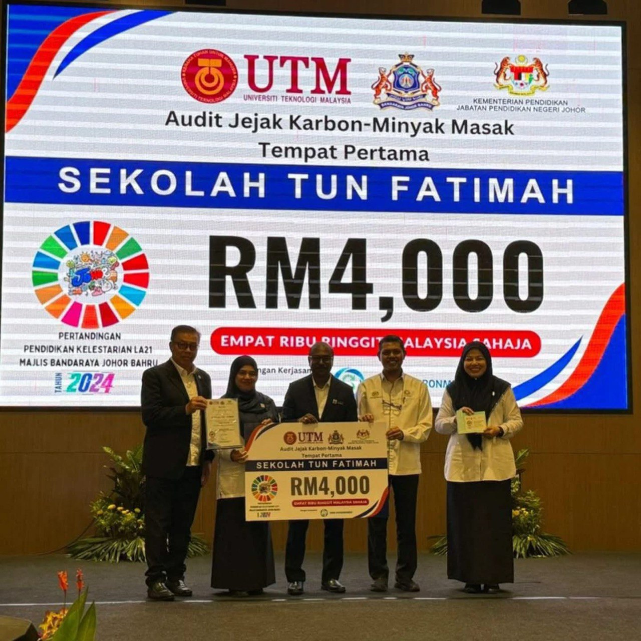 Sekalung penghargaan kepada warga Sekolah Tun Fatimah atas pencapaian cemerlang dalam Program Pendidikan Kelestarian LA21 MBJB Tahun 2024!