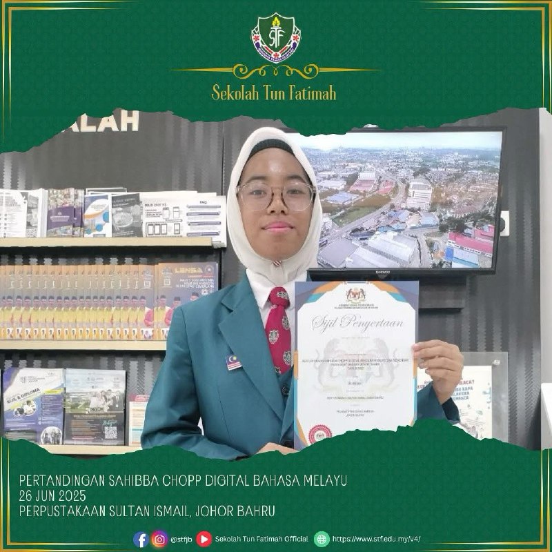 Tahniah kepada Nur Syamimi Qaisara binti Shahebol Fa’hadzil yang telah berjaya mara ke Pusingan Akhir dan muncul antara 10 peserta terbaik (Kategori Menengah). Pertandingan anjuran DBP dan Perpustakaan Sultan Ismail ini bukan sekadar permainan, tetapi medan menguji penguasaan Bahasa Melayu, kemahiran berfikir, dan strategi bermain Sahibba Digital. Syabas kepada peserta atas keyakinan tinggi, penguasaan kosa kata yang luas dan semangat bersaing yang hebat sepanjang pertandingan.
