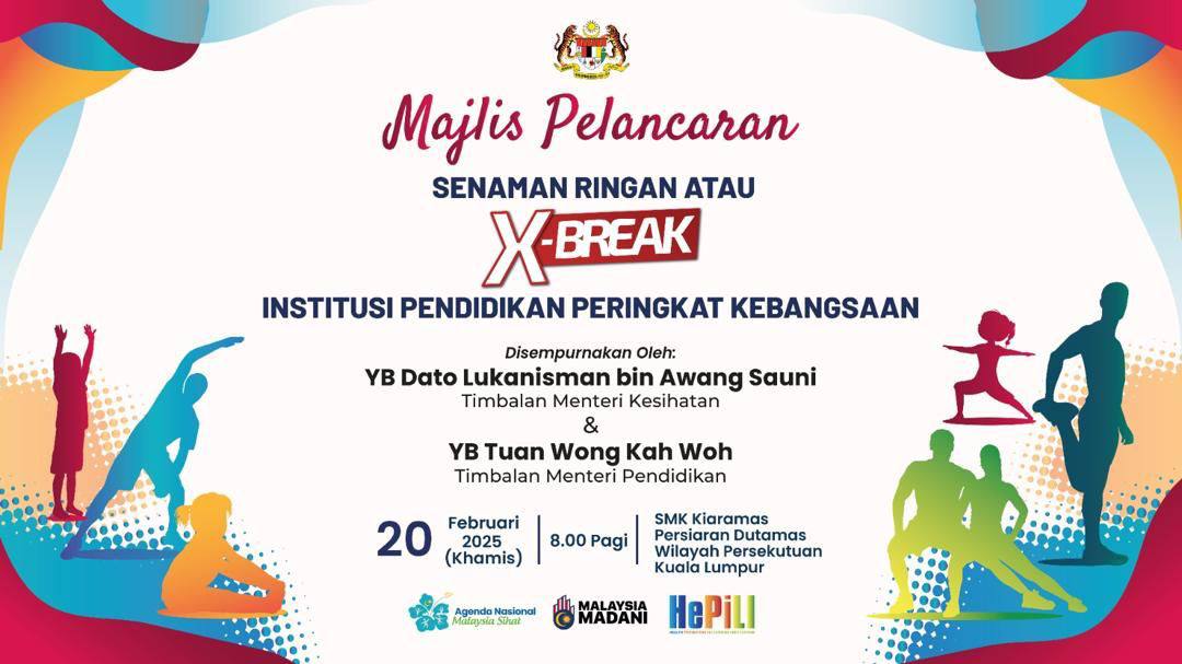Siaran Langsung Majlis Pelancaran Senaman Ringan (X-Break) Institusi Pendidikan Peringkat Kebangsaan telah berjaya dilaksanakan pada pagi ini, bertempat di Dewan Bestari dan Laman Puteri yang melibatkan semua murid STF.