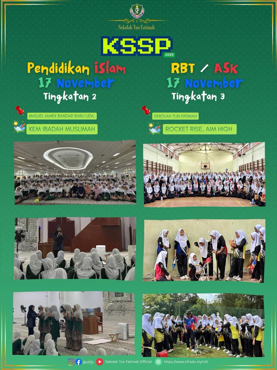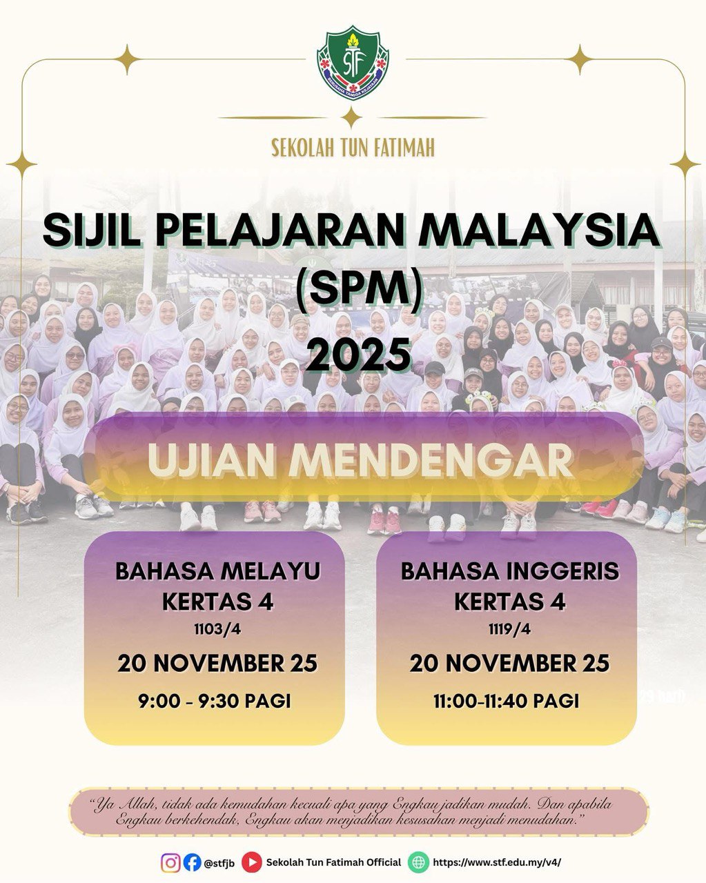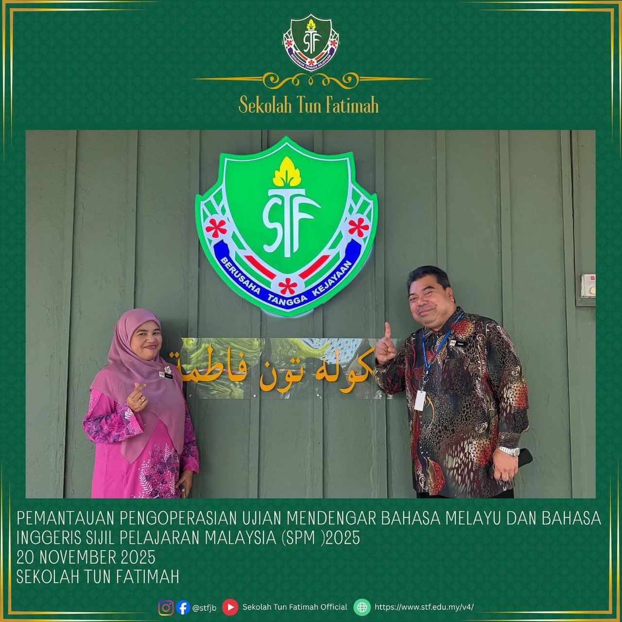 Sekolah Tun Fatimah telah menerima kunjungan rasmi daripada Pengarah Jabatan Pendidikan Negeri Johor, Tuan Haji Mohd Hanafi bin Samad, bersempena persediaan menghadapi peperiksaan UMBM dan UMBI SPM 2025. Lawatan ini amat bermakna dan diharapkan dapat memberi motivasi kepada seluruh warga STF dalam usaha meningkatkan kecemerlangan akademik, khususnya bagi calon SPM 2025.