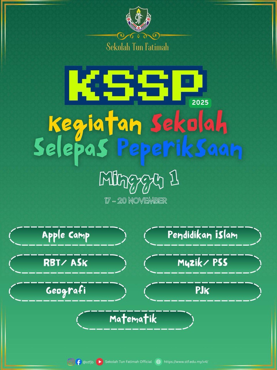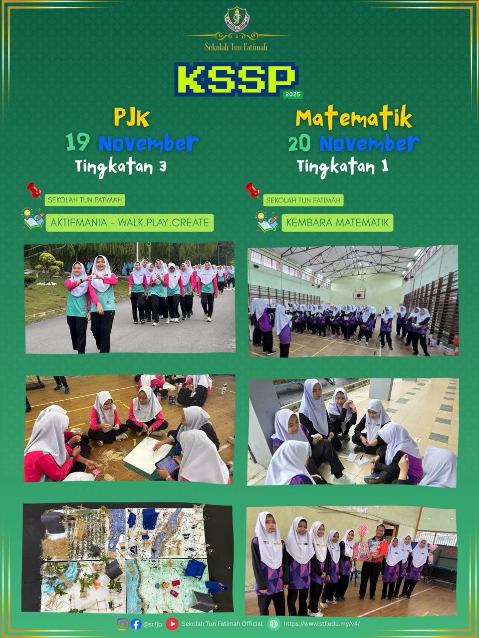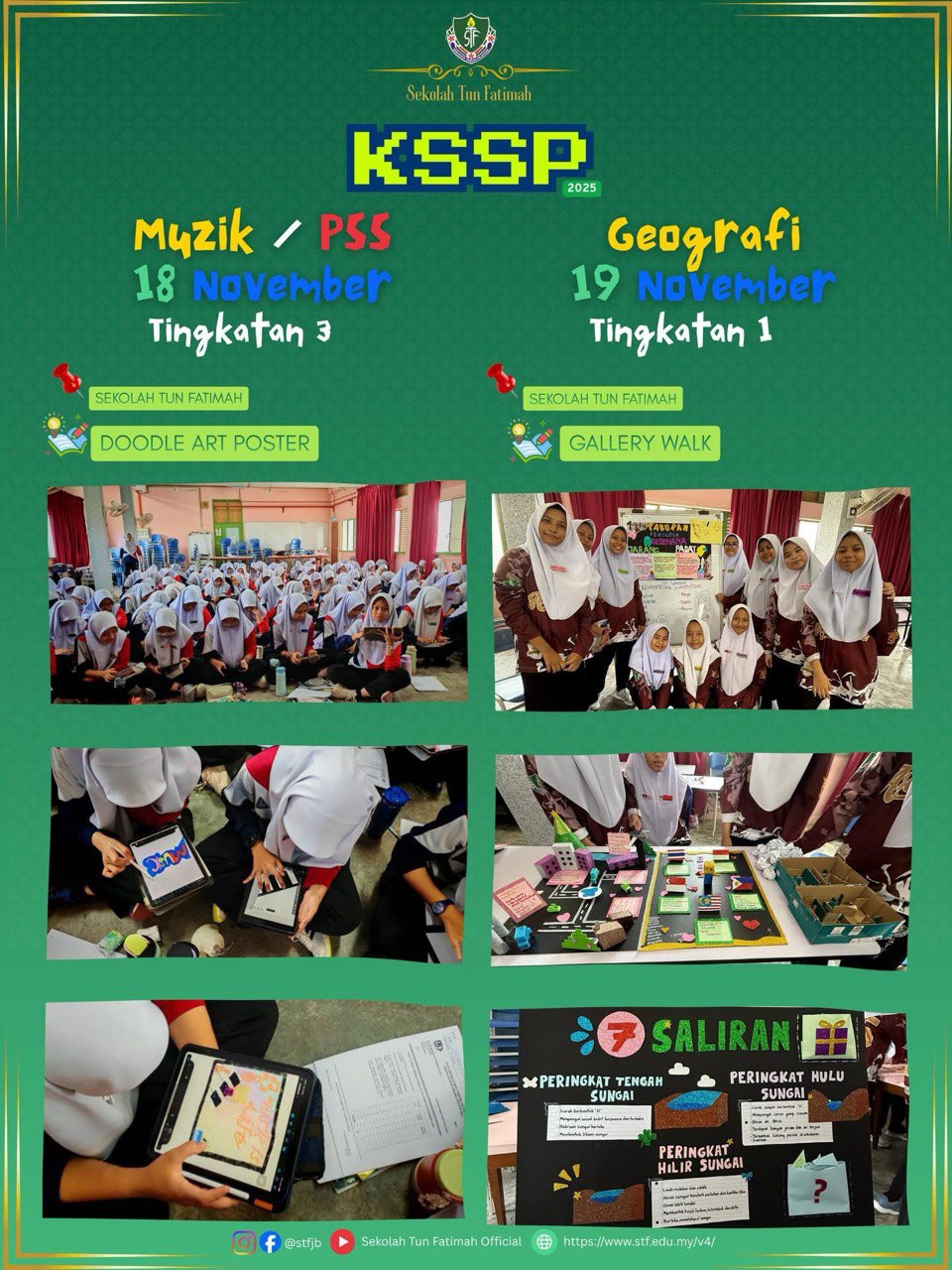 Sekolah Tun Fatimah telah menerima kunjungan rasmi daripada Pengarah Jabatan Pendidikan Negeri Johor, Tuan Haji Mohd Hanafi bin Samad, bersempena persediaan menghadapi peperiksaan UMBM dan UMBI SPM 2025. Lawatan ini amat bermakna dan diharapkan dapat memberi motivasi kepada seluruh warga STF dalam usaha meningkatkan kecemerlangan akademik, khususnya bagi calon SPM 2025.