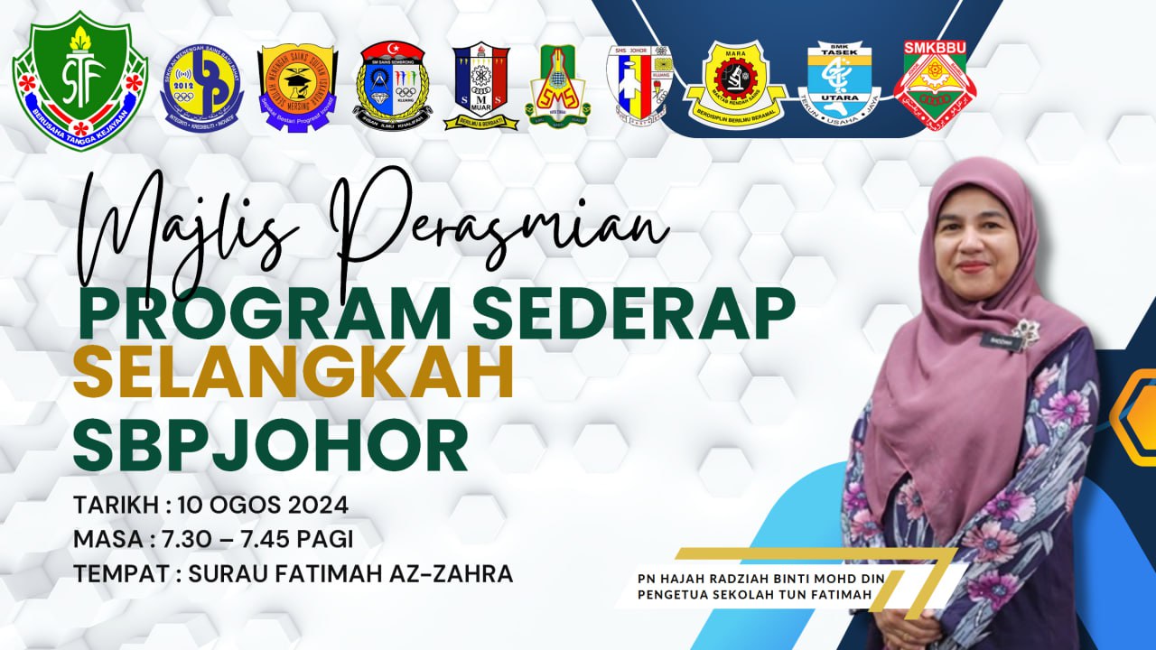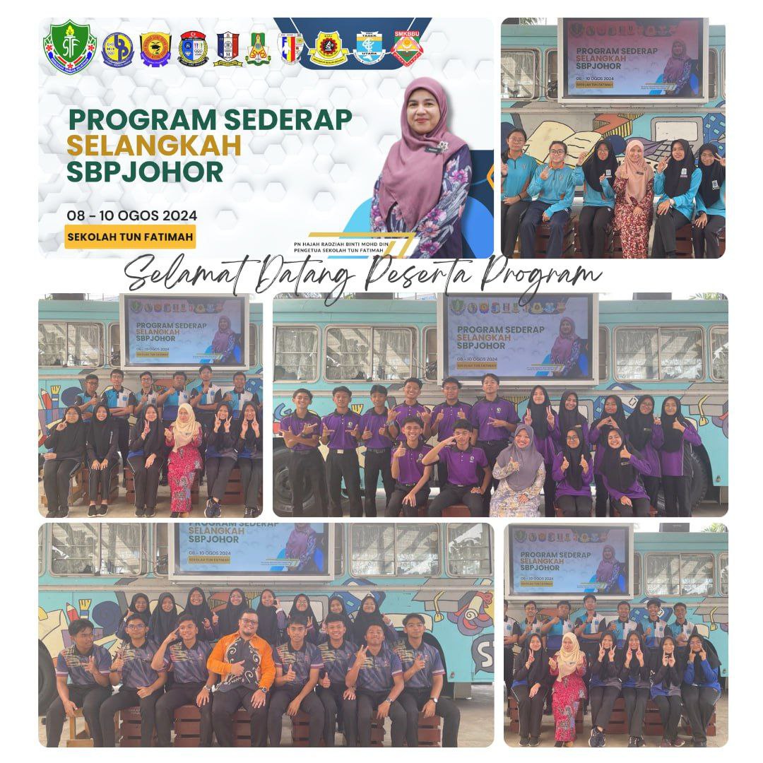 8 Ogos 2024 - Program Sederap Selangkah SBP Johor merupakan satu inisiatif kerjasama strategik antara Sekolah Tun Fatimah (STF) dan SBP Johor, bertujuan untuk memperkasa pencapaian murid-murid dalam menghadapi Sijil Pelajaran Malaysia (SPM) 2024. Program ini turut mengundang penyertaan dari SMK Bandar Baru Uda, SMK Tasek Utara dan MRSM Johor Bahru, menjadikannya sebuah usaha komprehensif yang melibatkan seramai 247 orang murid.