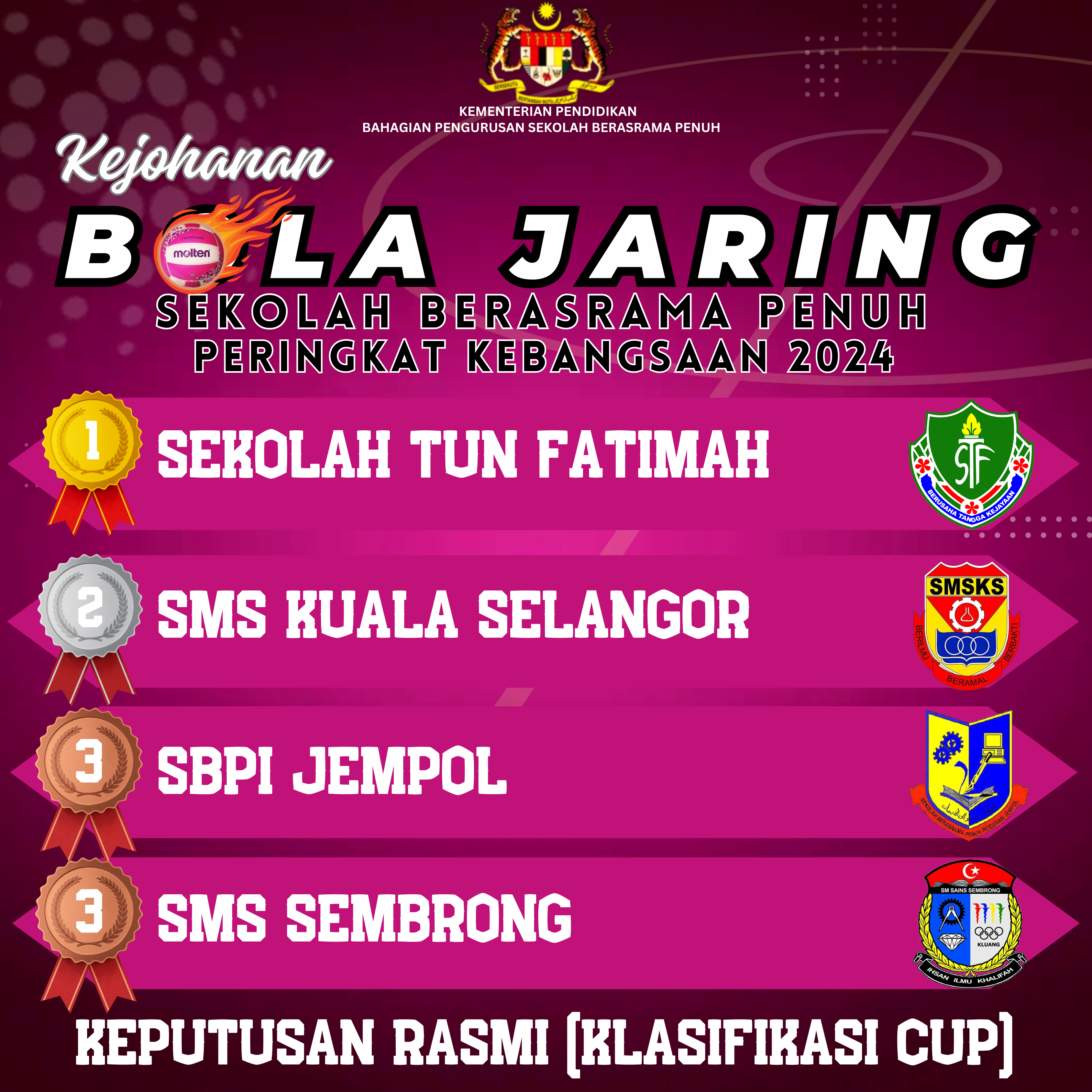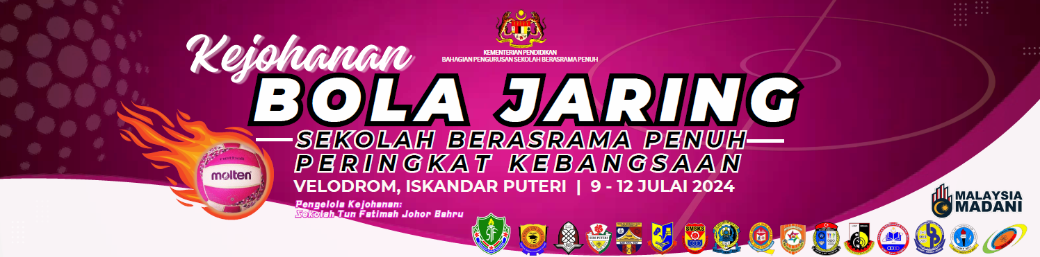 Selamat berjuang dengan semangat kesukanan kepada semua pemain Kejohanan Bola Jaring Sekolah Berasrama Penuh Peringkat Kebangsaan 2024 yang akan bermula pada 10 hingga 12 Julai 2024 di Velodrom Iskandar Puteri. Semua dipelawa untuk mengikuti perkembangan perlawanan dalam Kejohanan Bola Jaring Sekolah Berasrama Penuh Peringkat Kebangsaan 2024 melalui Laman Rasmi Kejohanan.