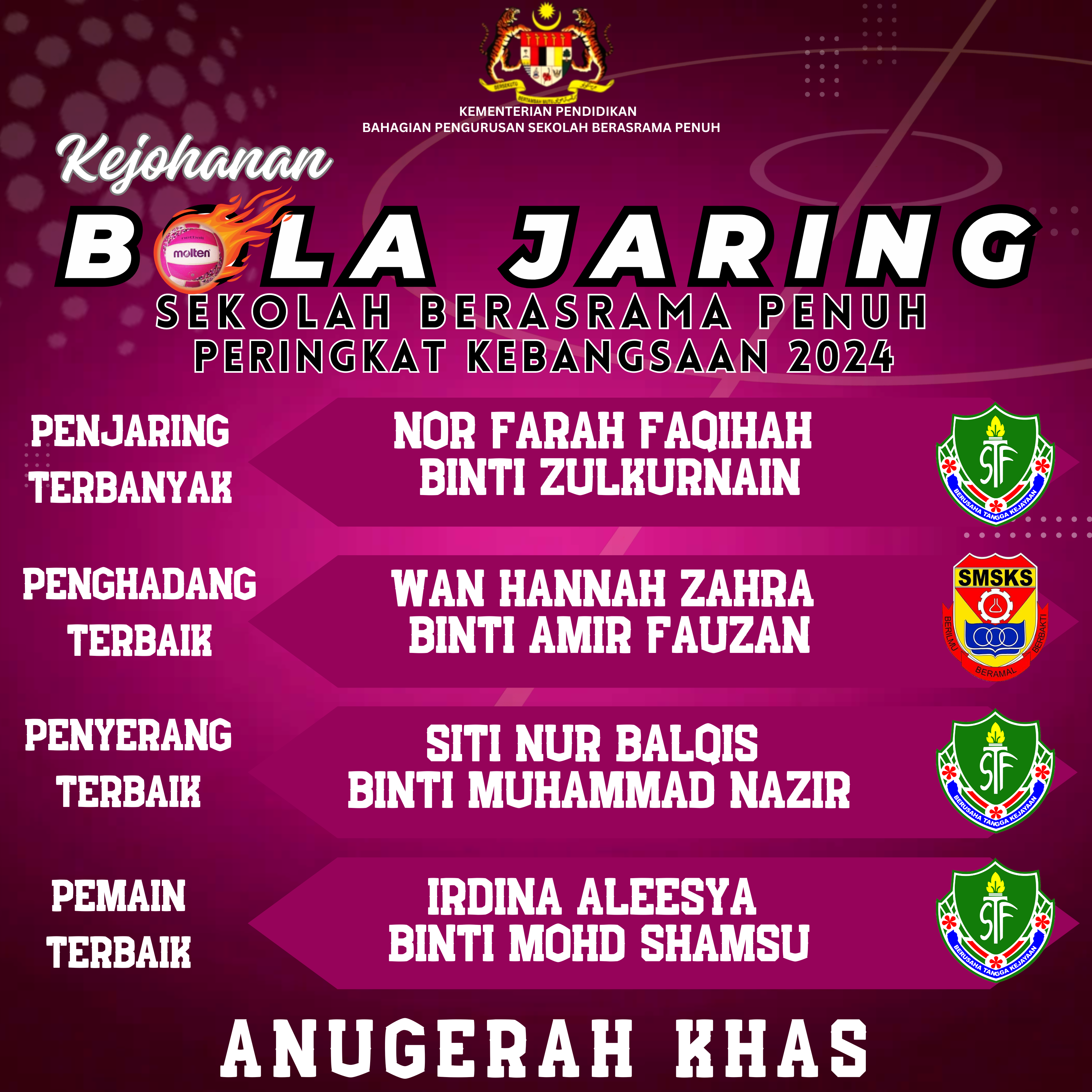 12 Julai 2024 - TIGRINE berjaya mengekalkan kejuaraan 8 tahun berturut-turut dalam Kejohanan Bola Jaring Sekolah Berasrama Penuh Peringkat Kebangsaan yang berlangsung di Velodrom Iskandar Puteri. Majlis Penutup disempurnakan oleh YBrs. En Mohd Fauzy Bin Sunary, Ketua Penolong Pengarah, Unit Pengurusan Asrama, Sukan dan Kokurikulum, BPSBP. KPM selaku wakil rasmi Pengarah BPSBP. KPM. 3 orang pemain TIGRINE juga mendapat anugerah khas iaitu Nor Farah Faqihah binti Zulkarnain sebagai Penjaring Terbanyak, Siti Nur Balqis binti Muhammad Nazir sebagai Penyerang Terbaik manakala Anugerah Pemain Terbaik dimenangi Irdina Aleesya binti Mohd Shamsu. Syabas dan Tahniah kepada semua pemenang dan didoakan agar semua pasukan selamat sampai di destinasi masing-masing.