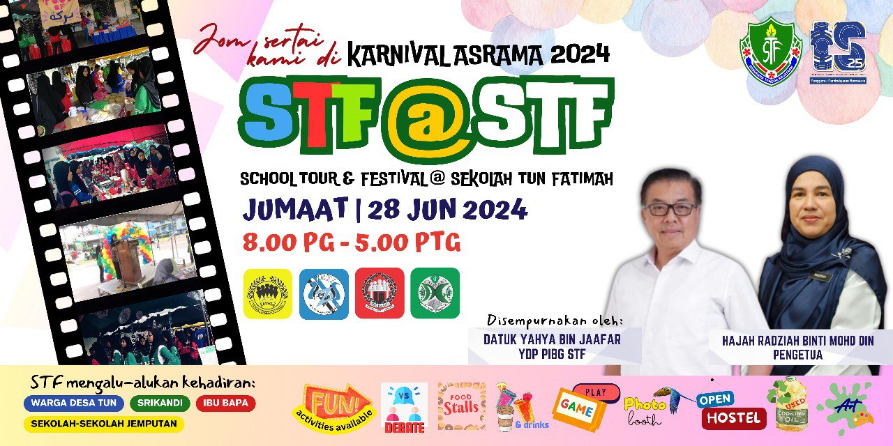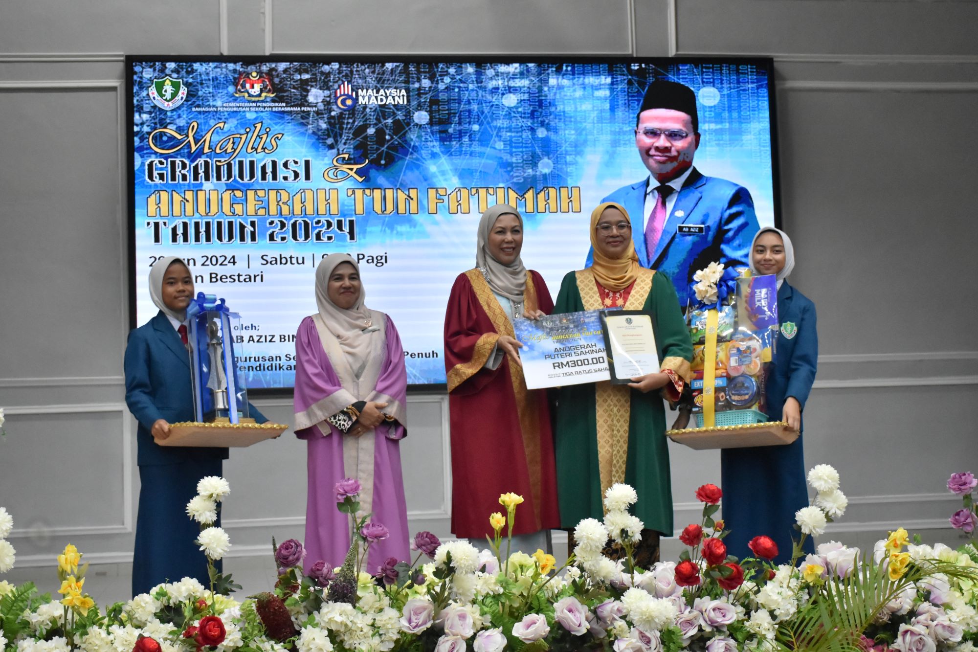 29 Jun 2024 - YB Dato' Saiful Yazan menerima Anugerah Jasa Gemilang sempena Majlis Graduasi dan Anugerah Tun Fatimah 2024 yang berlangsung di Dewan Bestari pagi ini. YB Dato' diwakili oleh isterinya, Datin Hajjah Shaliza binti Idris. Majlis disempurnakan oleh Yang Berbahagia Datin Rosliza binti Rosli, Timbalan Pengarah Sektor Pengurusan Kurikulum , Bahagian Pengurusan Sekolah Berasrama Penuh KPM selaku wakil rasmi Pengarah. Seramai 185 orang menerima anugerah yang terdiri daripada murid dan guru melibatkan kategori Murid Cemerlang Ujian Akhir Sesi Akademik 203 dan pencapaian SPM 2023. Seramai 3 orang murid menerima anugerah tertinggi iaitu Anugerah Kurikulum yang dinobatkan kepada Nurul Hidayah binti Norazam, Alia Natasha binti Mohd Ali menerima Anugerah Puteri Sakinah manakala Nur Azni Afiqah binti Mohd Zaini menerima Anugerah Srikandi. Anugerah juga diberikan kepada Panitia yang menunjukkan Peningkatan Terbaik Mata Pelajaran SPM 2023 iaitu mata pelajaran Pendidikan Islam, Fizik dan Bahasa Inggeris. Anugerah Mata Pelajaran Terbaik SPM diberikan kepada Panitia Pendidikan Islam, Matematik, Bahasa Inggeris dan Biologi manakala Anugerah Khas Mata Pelajaran disandang Panitia Biologi yang mendapat kedudukan tempat pertama SBP dan Pendidikan Islam mendapat tempat ketiga SBP. Teknologi AI diaplikasi dalam majlils ini yang memaparkan ucapan Pengarah Bahagian Pengurusan Sekolah Berasrama Penuh KPM. Syabas dan tahniah kepada semua warga STF.