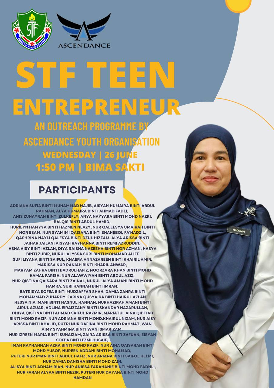 26 Jun 2024 - Taklimat mengenai program TEENAGE ENTREPRENEUR SCHOLARSHIP 2024 telah disampaikan oleh Ascendance Sdn Bhd pada hari Rabu, 26 Jun 2024 dari jam 1.50 hingga 4.30 petang. Seramai 50 orang murid Tingkatan 2 dan 3 telah terlibat dan akan diberikan bimbingan melalui kelab-kelab di bawah Ascendance mengenai hal berkaitan keusahawanan dalam tempoh 6 bulan. Semoga murid-murid yang terpilih dapat mengurus masa dan memberikan komitmen yang tinggi dalam memyelesaikan tugasan yang diberikan dan memdapat manfaat daripada aktiviti- aktiviti yang diadakan.