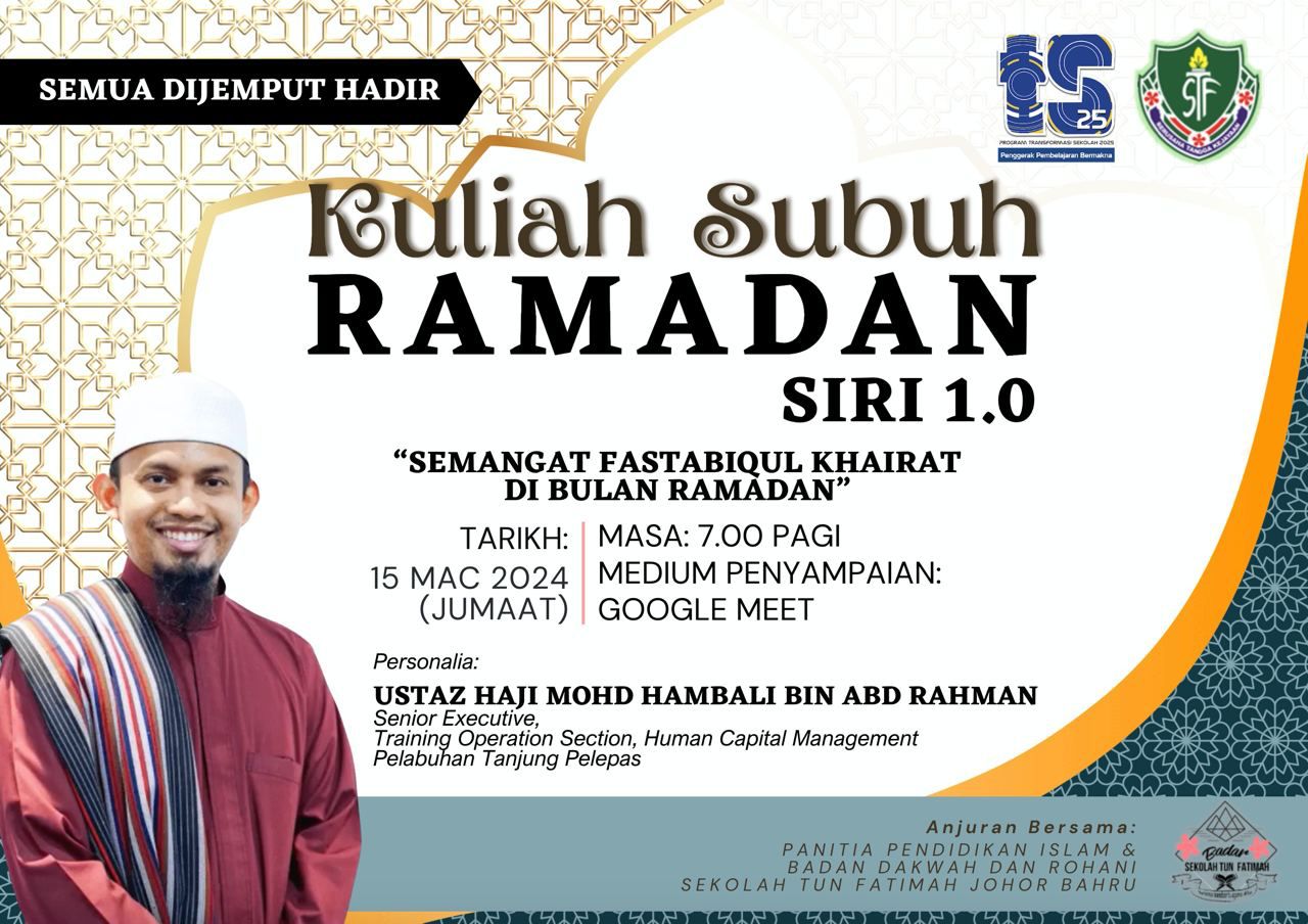Kuliah Subuh Ramadan 1.0 - “Semangat Fastabiqul Khairat di Bulan Ramadan” telah dijayakan oleh Unit HEM dan Panitia Pendidikan Islam secara hybrid pada ketetapan berikut: