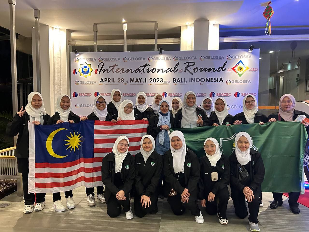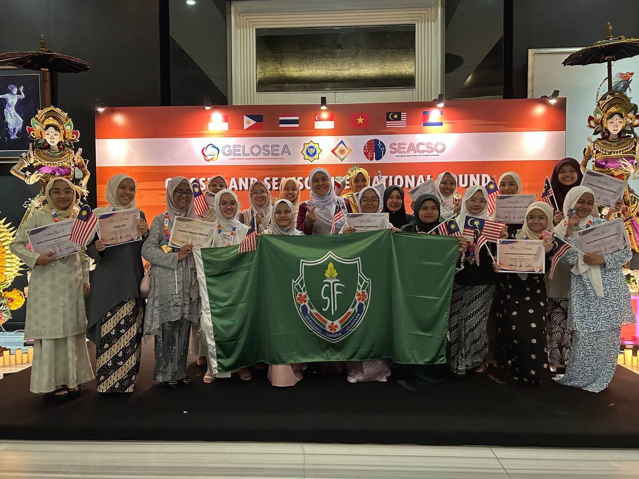 1st May 2023 - 16 students from Form 2 to Form 4, accompanied by the Principal, Hjh Nor Hayati binti Yusoff, Madam Siti Norfalisha binti Rusli and Madam Roziana binti Zakaria left Malaysia on 27th April 2023 to participate in GELOSEA International Round 2023 at Bali, Indonesia. Other neighbouring countries which also participated in this competition are Singapore, Vietnam, Cambodia, Philippines, Thailand and also Indonesia. It is with great pleasure for us to share the results of GELOSEA International Round 2023 at Bali which commenced from 28th April to 1st May 2023. We have 4 Bronze awards recipients and 9 silver awards recipients. Faseeh Fardha Firdaus and Najla Safiyya binti Mohd Razak were awarded gold and an outstanding achievement by Miza Zafirah binti Mohamad Zaki was rewarded by Diamond award. To make it even special, Miza Zafirah and Faseeh Fardha won 1st runner up for Top Scorer in their respective category. We would like to congratulate all the participants for marking another international achievement for STF. We also would like to thank Bonda Nor Hayati and the parents for their endless support.