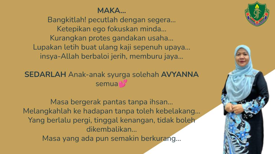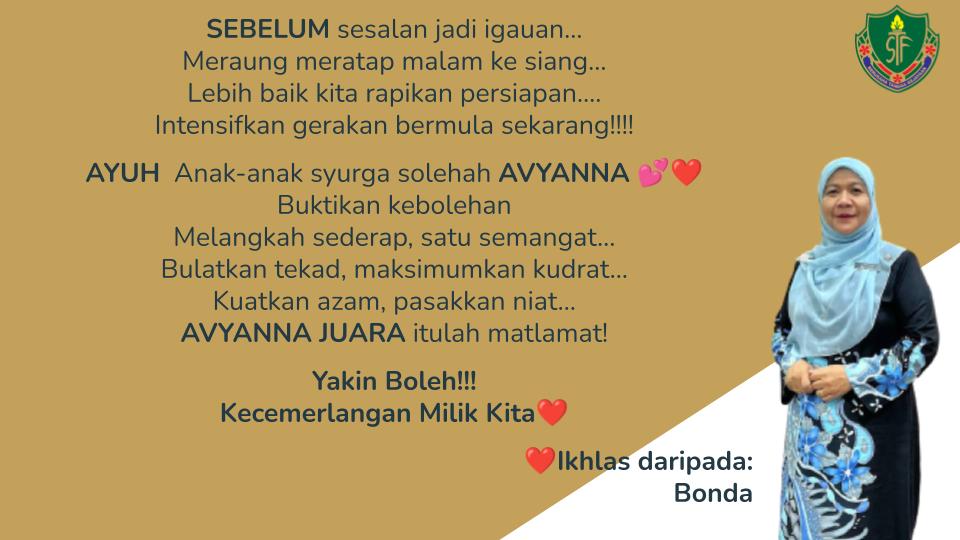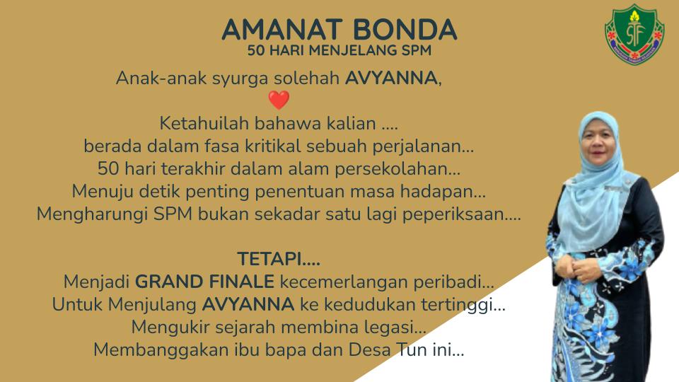 1 Jan 2023 : Majlis Pelancaran 50 Hari Menjelang SPM disempurnakan oleh Hajah Nor Hayati binti Yusoff, Pengetua Cemerlang STF di Dewan Bestari STF. Semoga anak syurga solehah Avyanna meraih kejayaan cemerlang dalam SPM.