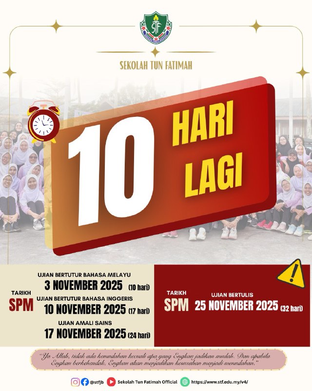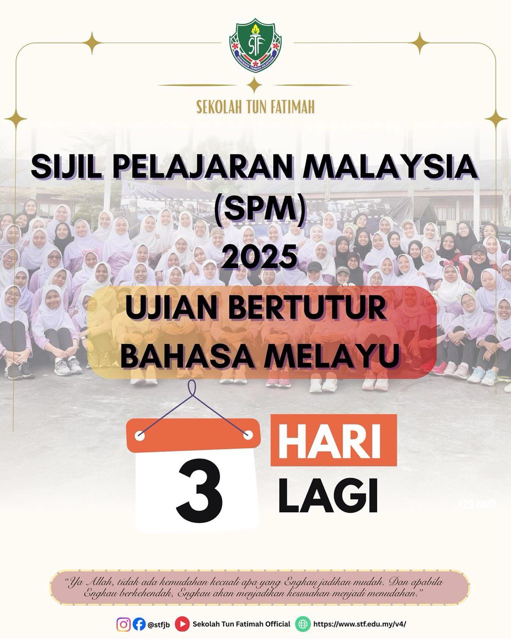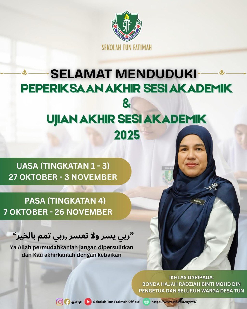 Warga Sekolah Tun Fatimah mengucapkan selamat maju jaya kepada semua murid yang akan menduduki PASA dan UASA tahun ini. Teruskan usaha, yakin dengan kemampuan diri dan berilah yang terbaik dalam setiap helaian kertas jawapan. Ingatlah, kejayaan bukan hanya diukur dengan keputusan, tetapi dengan usaha gigih, kejujuran dan semangat pantang menyerah yang kamu tunjukkan sepanjang perjalanan ini. Setiap doa, setiap pengorbanan dan setiap titik peluh pasti membawa makna yang besar.