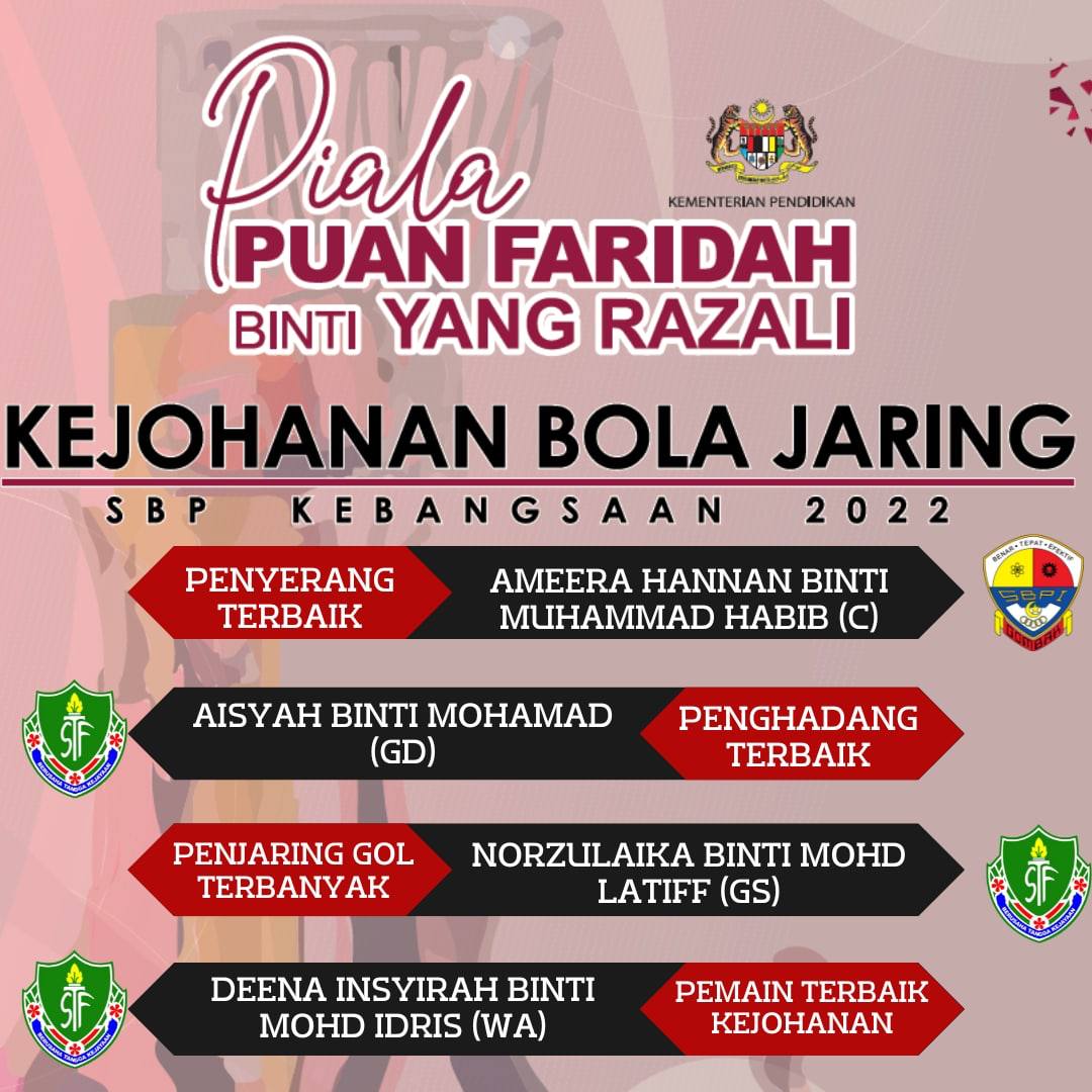 1 Okt. 2022 - Pasukan Bola Jaring STF, TIGRINE berjaya mengekalkan kejuaraan berturut-turut 6 tahun Kejohanan Bola Jaring SBP Kebangsaan 2022 Piala Puan Faridah binti Yang Razali. Pertandingan yang berlangsung di Centre Court Paroi, Seremban menemukan pasukan TIGRINE dengan pasukan dari SBP Integrasi Gombak (INTERGOMB) di perlawanan akhir di mana TIGRINE telah mengalahkan INTERGOMB dengan 39 berbalas 20. Syabas dan Tahniah atas kejayaan yang membanggakan ini.