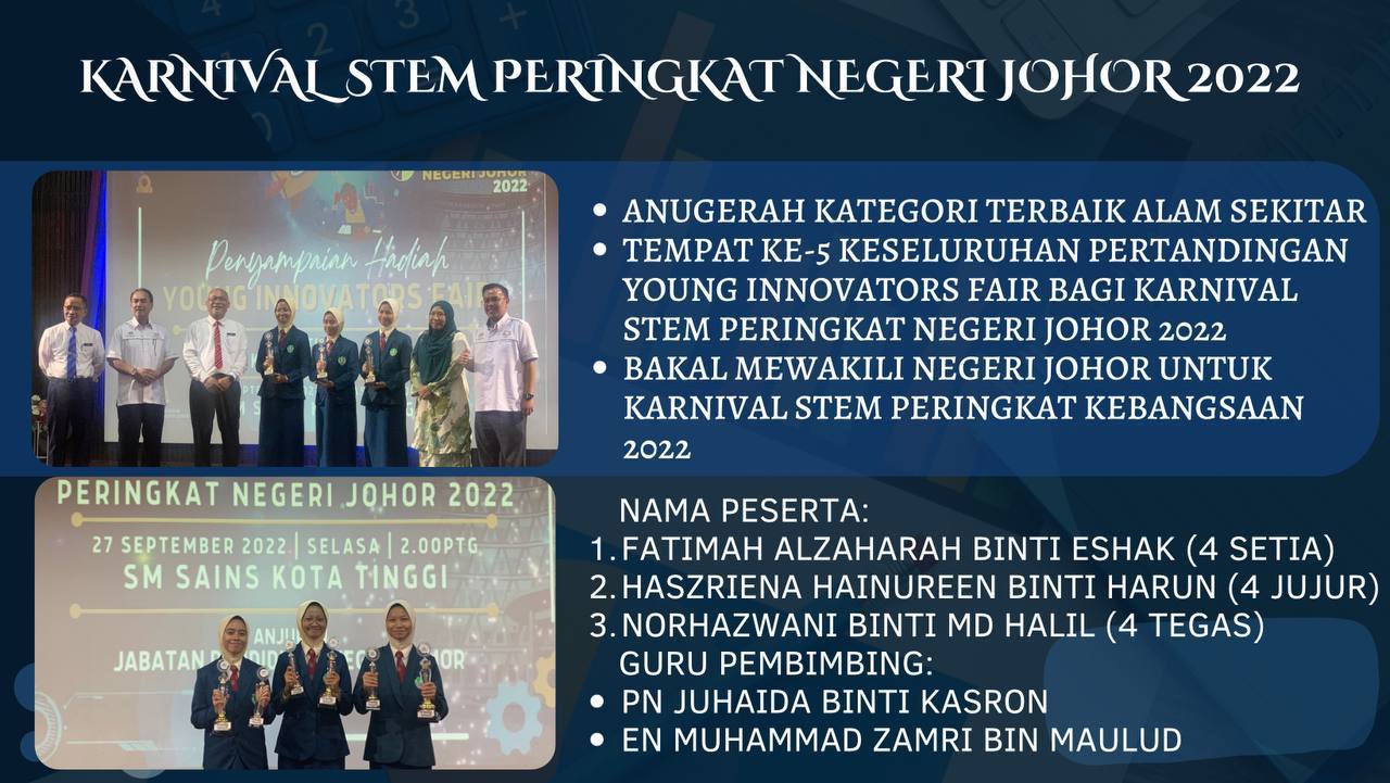 27 Sept. 2022 - STF telah menyertai Karnival STEM Peringkat Negeri Johor di SM Sains Kota Tinggi dan memenangi Anugerah Kategori Terbaik Alam Sekitar, Tempat Kelima Keseluruhan Pertandingan Young Innovators Fair bagi Karnival STEM Peringkat Negeri Johor dan akan mewakili Negeri Johor untuk Karnival STEM Peringkat Kebangsaan 2022.