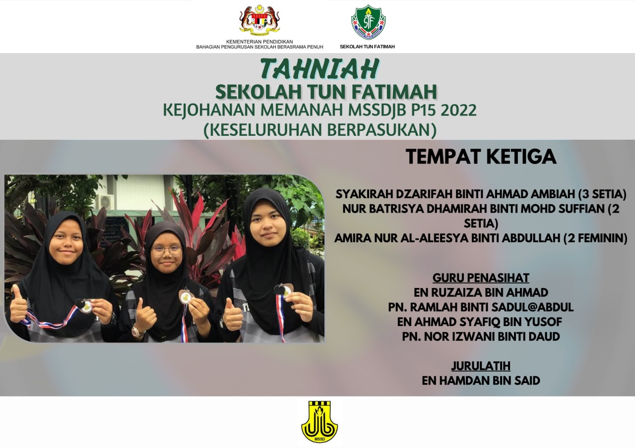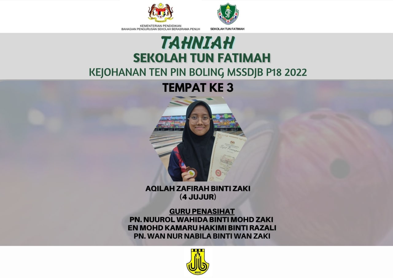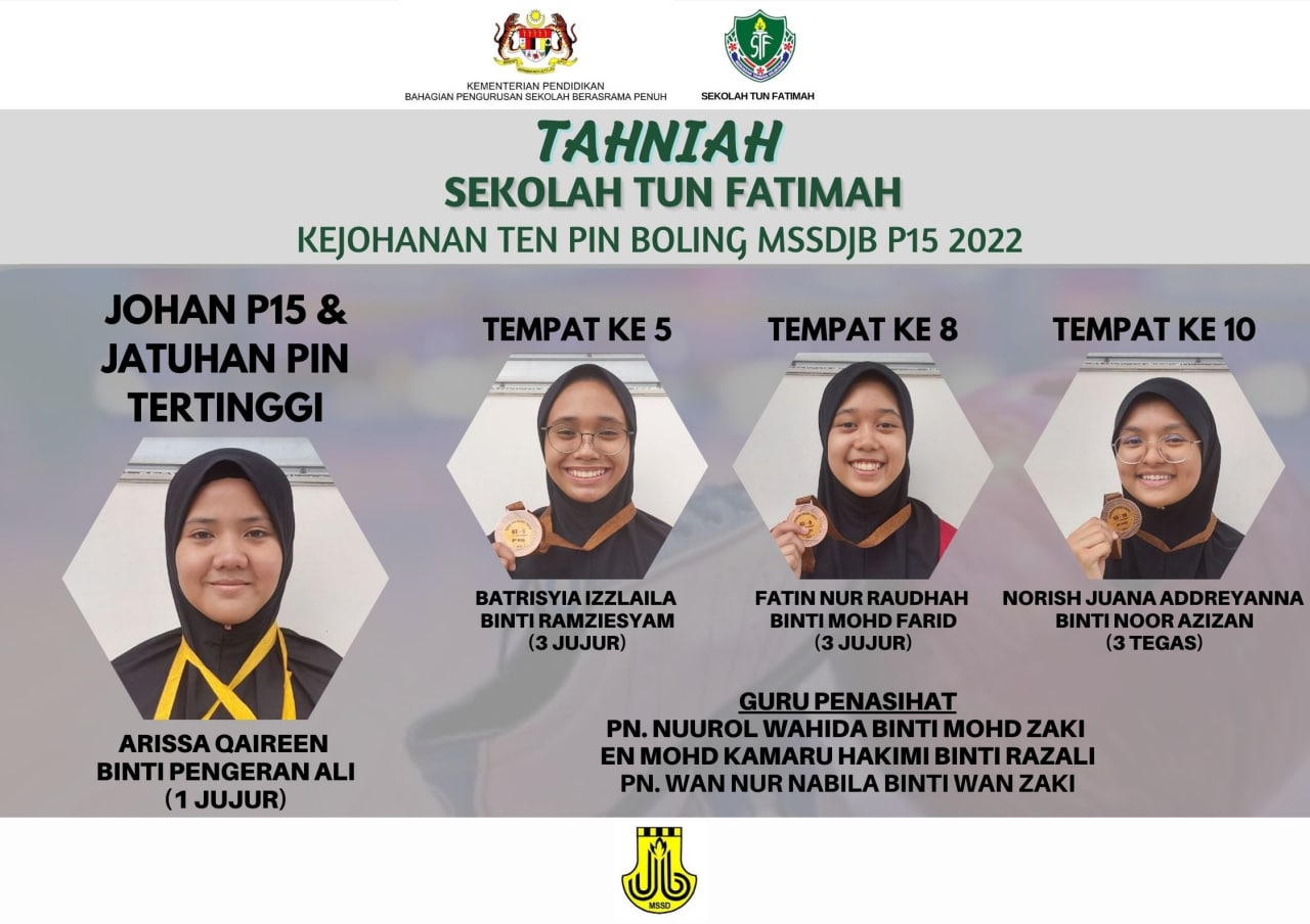 Alhamdullilah. Terima kasih kepada kontingen Sekolah Tun Fatimah yang diurus oleh guru penasihat Pn. Nuurol Wahida binti Mohd Zaki, En Mohd Kamaru Hakimi binti Razali dan Pn. Wan Nur Nabila binti Wan Zaki serta ibu bapa yang memberi sokongan kepada pasukan ten pin boling STF.