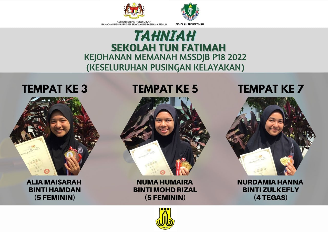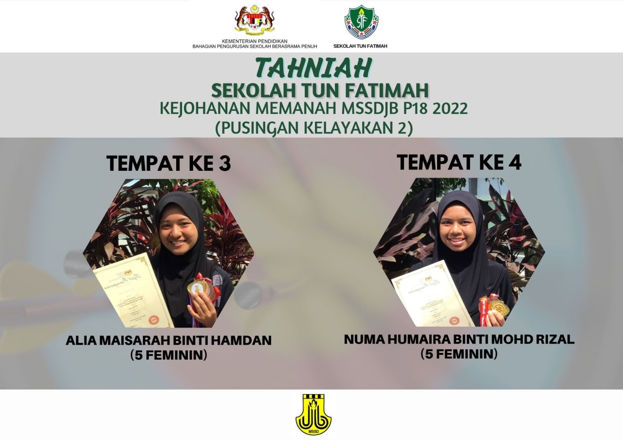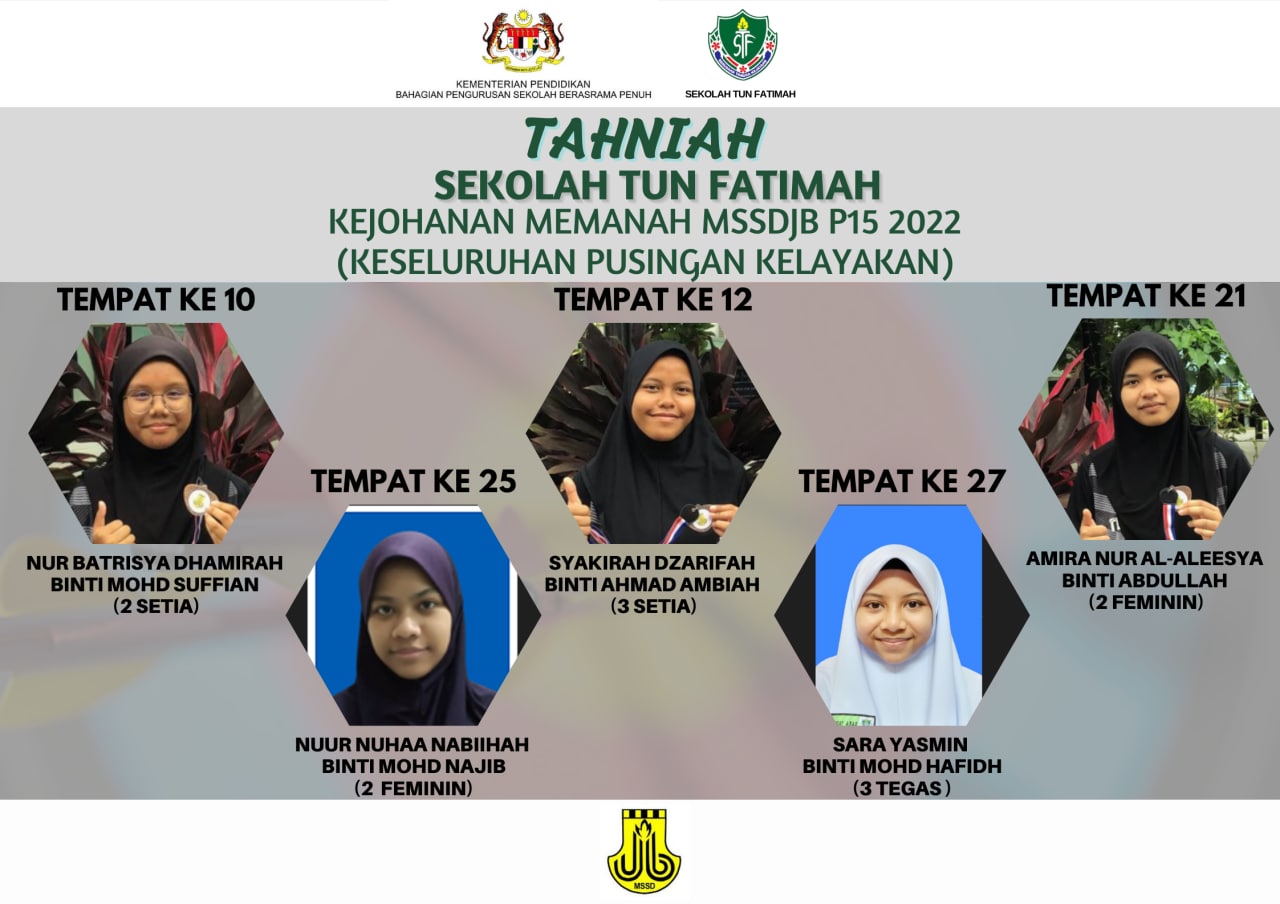 Alhamdullilah. Terima kasih kepada kontingen Sekolah Tun Fatimah yang diurus oleh guru penasihat Pn. Nuurol Wahida binti Mohd Zaki, En Mohd Kamaru Hakimi binti Razali dan Pn. Wan Nur Nabila binti Wan Zaki serta ibu bapa yang memberi sokongan kepada pasukan ten pin boling STF.