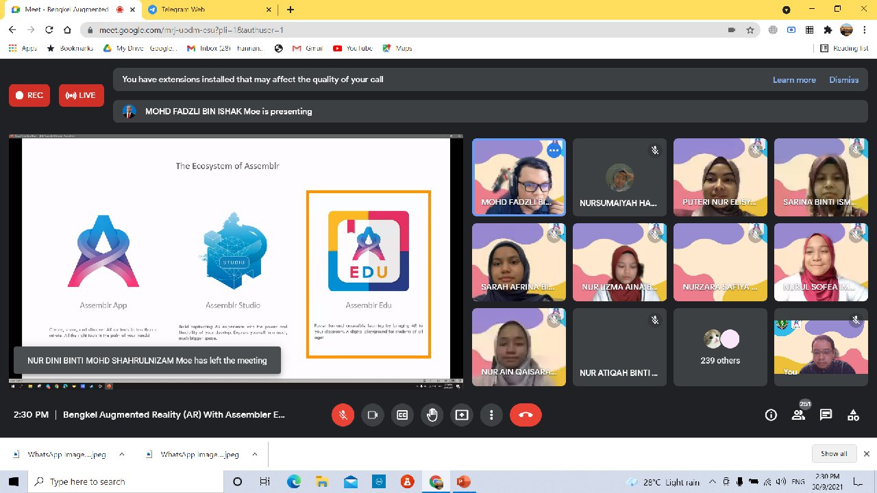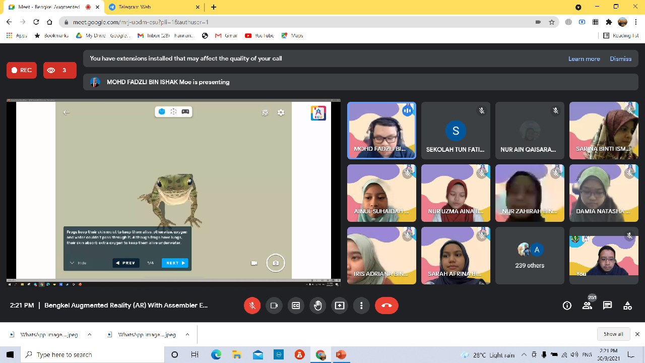 30 Sept. 2021 - Bengkel Augmented Reality (AR) With Assembl Edu Dalam Pembelajaran telah berlangsung yang melibatkan semua pelajar tingkatan satu hingga tiga Sekolah Tun Fatimah bersama En Mohd Fadzli Bin Ishak, Penolong Pengarah Unit TMK, Sektor Pembelajaran JPN Johor yang juga merupakan Assemblr Certified Educator Level 5. Sesi bengkel juga turut dihadiri oleh Miss Anita Yustisia, CCO Assemblr. Pelajar Sekolah Tun Fatimah amat bertuah kerana merupakan sekolah pertama yang diberi peluang mengksplorasi aplikasi Assemblr tersebut.