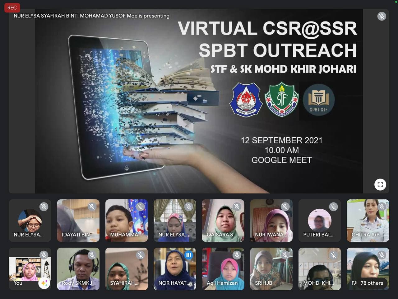 12 Sept. 2021 - Program Virtual CSR@SSR bersama SK Mohd. Khir Johari, Johor Bahru telah berlangsung pada jam 10 pagi hingga 11.30 pagi. Program ini telah dirasmikan oleh Bonda Pengetua Cemerlang, Bonda Nor Hayati binti Yusoff. Guru Besar SK Mohd Khir Johari, En Rodyisnansyah bin Julaihi juga turut menyampaikan pesanan kepada semua peserta. Program ini telah dilaksanakan di rumah kediaman masing-masing melalui platform Google Meet.