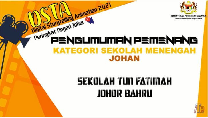8 Sept. 2021 - STF melalui penyertaan dari Mai Alisha Sofia Binti Mohamad Husni (5 Feminin), Nik Iman Nabilah Bt Shamsul Anuar (5 Feminin), Anyssa Farhana Bt Aswat (5 Bersih) dan Aqilah Hazirah Ilyana Binti Albert Feisal @ Muhammad Feisal (5 Jujur) dimbimbing Puan Nur Safiqa binti Sapar terus mengulangi kejayaan tahun lepas dengan melakar kejayaan sebagai Johan Digital Storytelling Animation (DSTA) 2021 Peringkat Negeri Johor yang telah diumumkan semalam melalui atas talian. STF akan mewakili Johor untuk ke DSTA Peringkat Kebangsaan dan semoga beroleh Johan seperti mana kejayaan tahun lepas. Sama-sama kita doakan.