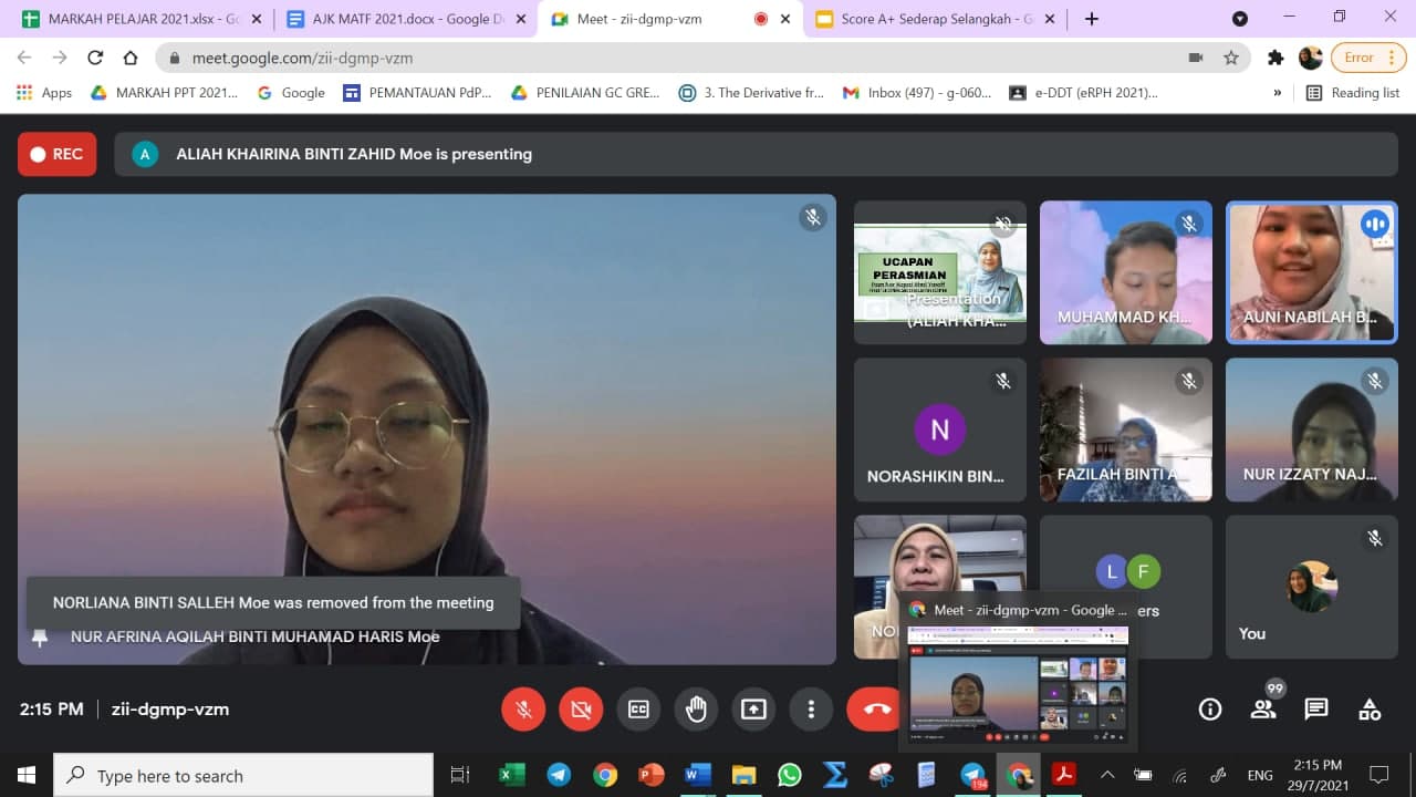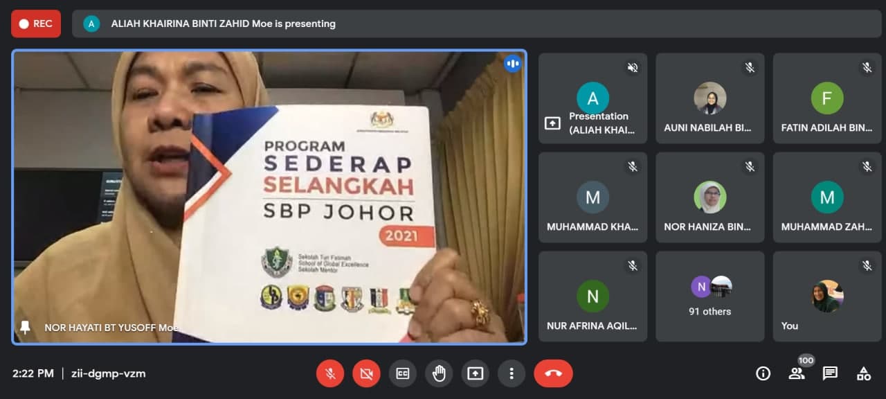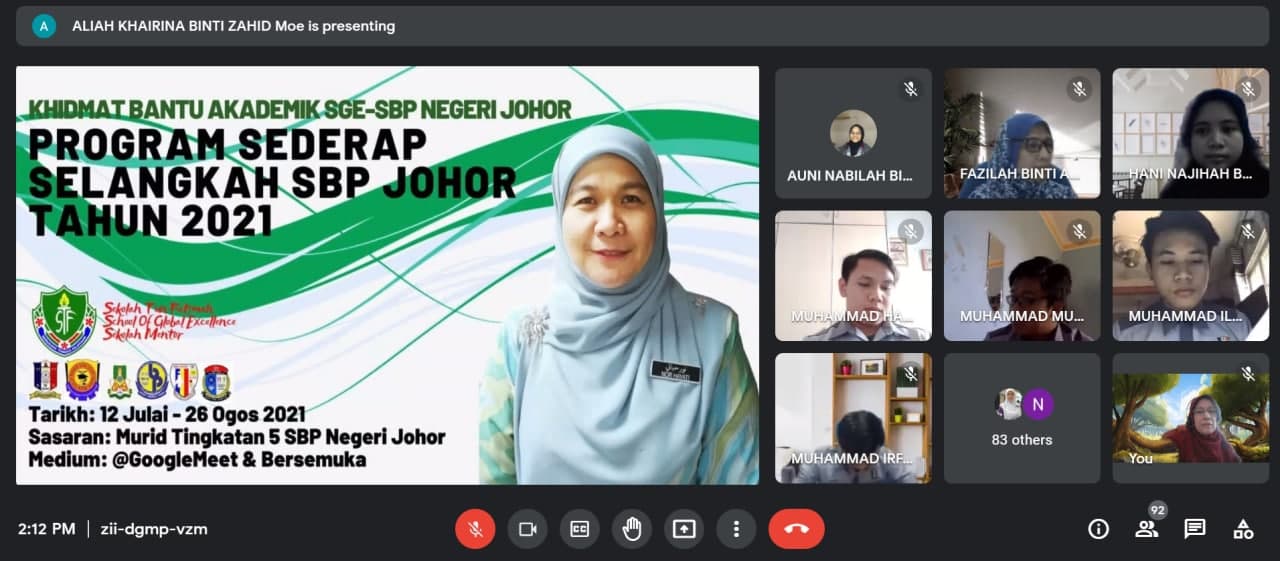 30 Julai 2021- Program Khidmat Bantu SGE-SBP 2021 yang dinamakan PROGRAM SEDERAP SELANGKAH SBP JOHOR dianjurkan dan dikendalikan oleh Sekolah Tun Fatimah, melibatkan 4 subjek elektif iaitu Matematik Tambahan, Fizik, Kimia dan Biologi. Dimulai dengan ujian pra, diikuti dengan pembentangan/perbincangan kumpulan mengikut 3 tahap pencapaian murid dan diakhiri dengan ujian post. Diharapkan agar program yang dilaksanakan bermula daripada 12 Julai 2021 dan masih berlangsung sehingga 26 Ogos 2021 ini akan dapat memberi impak yang besar serta membantu semua murid SBP Johor untuk mencapai kecemerlangan akademik yang lebih gemilang.
