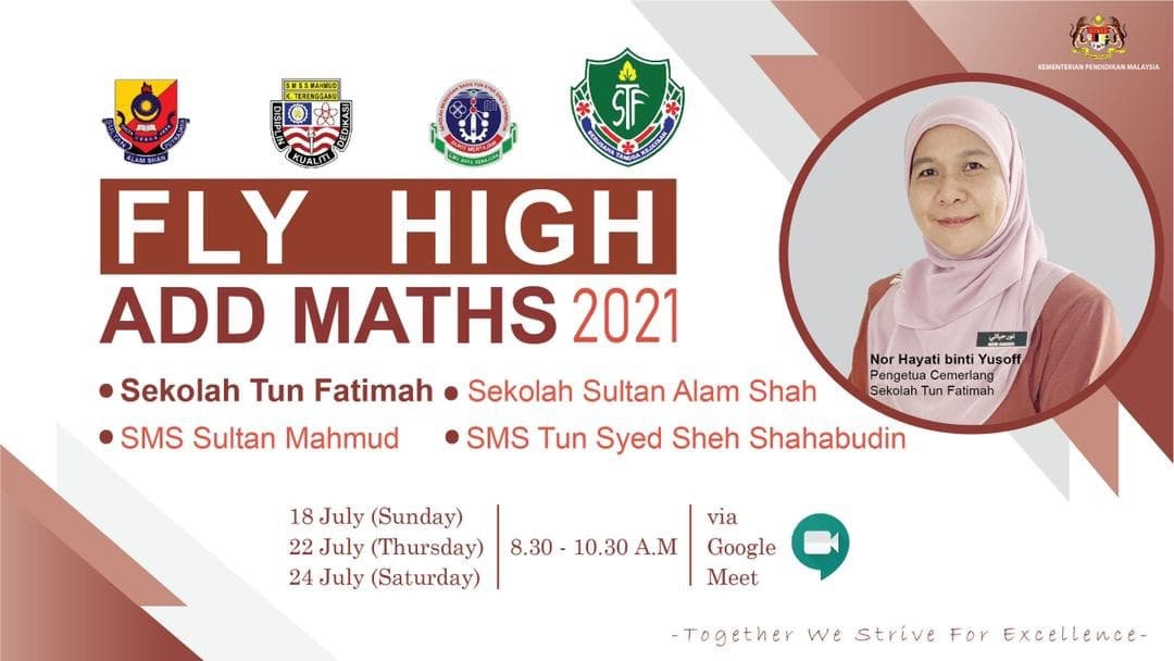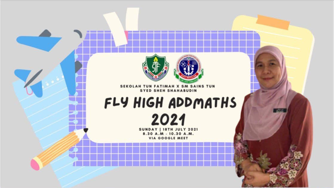 18 Julai 2021 : Fly High Add Maths 2021 merupakan program perkongsian pintar yang sama sahaja dengan program yang lain. Cuma kali ini kita lebarkan sayap ke semua zon dengan mengambil salah sebuah SBP sebagai rakan program untuk 3 zon. SMS Tun Syed Sheh Shahabudin mewakili Zon Utara, SMS Sultan Mahmud mewakili Zon Timur dan Sekolah Sultan Alam Shah mewakili Zon Tengah. Program Fly High Addmaths 2021 berlangsung secara maya dianjurkan oleh Panitia Matematik Tambahan Sekolah Tun Fatimah. Program ini melibatkan 45 orang pelajar Tingkatan 5 Sekolah Tun Fatimah dan mendapat kerjasama daripada guru-guru Matematik Tambahan SM Sains Tun Syed Sheh Shahabudin dan 46 orang pelajar Tingkatan 5 SM Sains Tun Syed Sheh Shahabudin. Program ini bertujuan untuk memantapkan lagi konsep dalam subjek Matematik Tambahan para pelajar menerusi pembentangan para pelajar. Melalui kolabrasi antara dua buah sekolah ini, para pelajar dapat memperoleh pelbagai tips dan input untuk diaplikasikan dalam peperiksaan SPM akan datang. Sentuhan kali ini diharapkan anak-anak syurga solehah kita berpeluang untuk bertukar-tukar pendapat secara maya dalam teknik menjawab soalan, serta semangat untuk membantu rakan dan tidak segan / malu untuk memperbaiki kelemahan, malahan akan membangkitkan semangat untuk berusaha menjadi ‘duta kecil’ kepada rakan-rakan yang lain. Program ini akan diteruskan lagi dengan siri yang akan datang bersama beberapa sekolah lagi. Semoga program seperti ini dapat memberi manfaat berguna buat para pelajar SPM tahun ini.