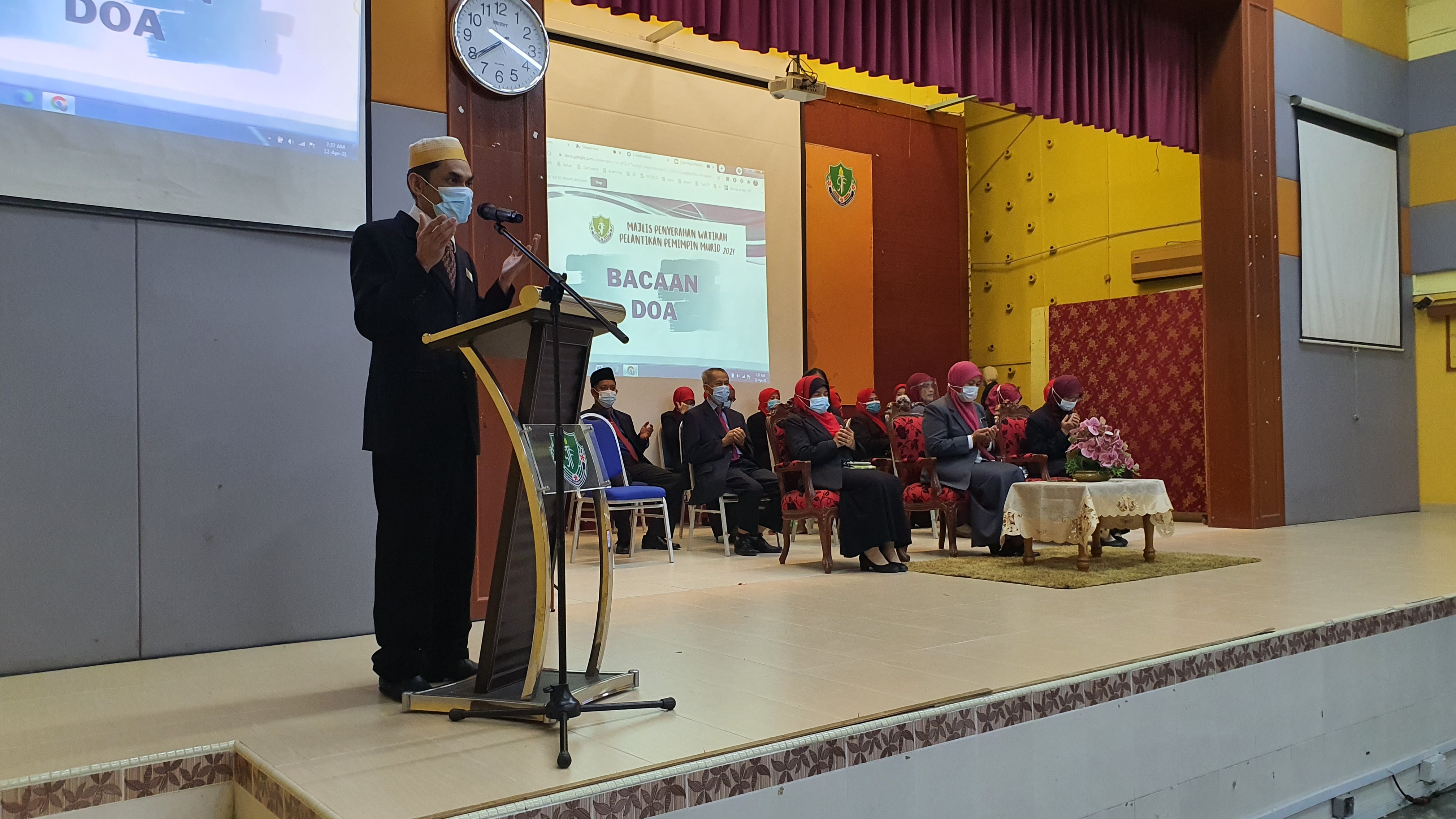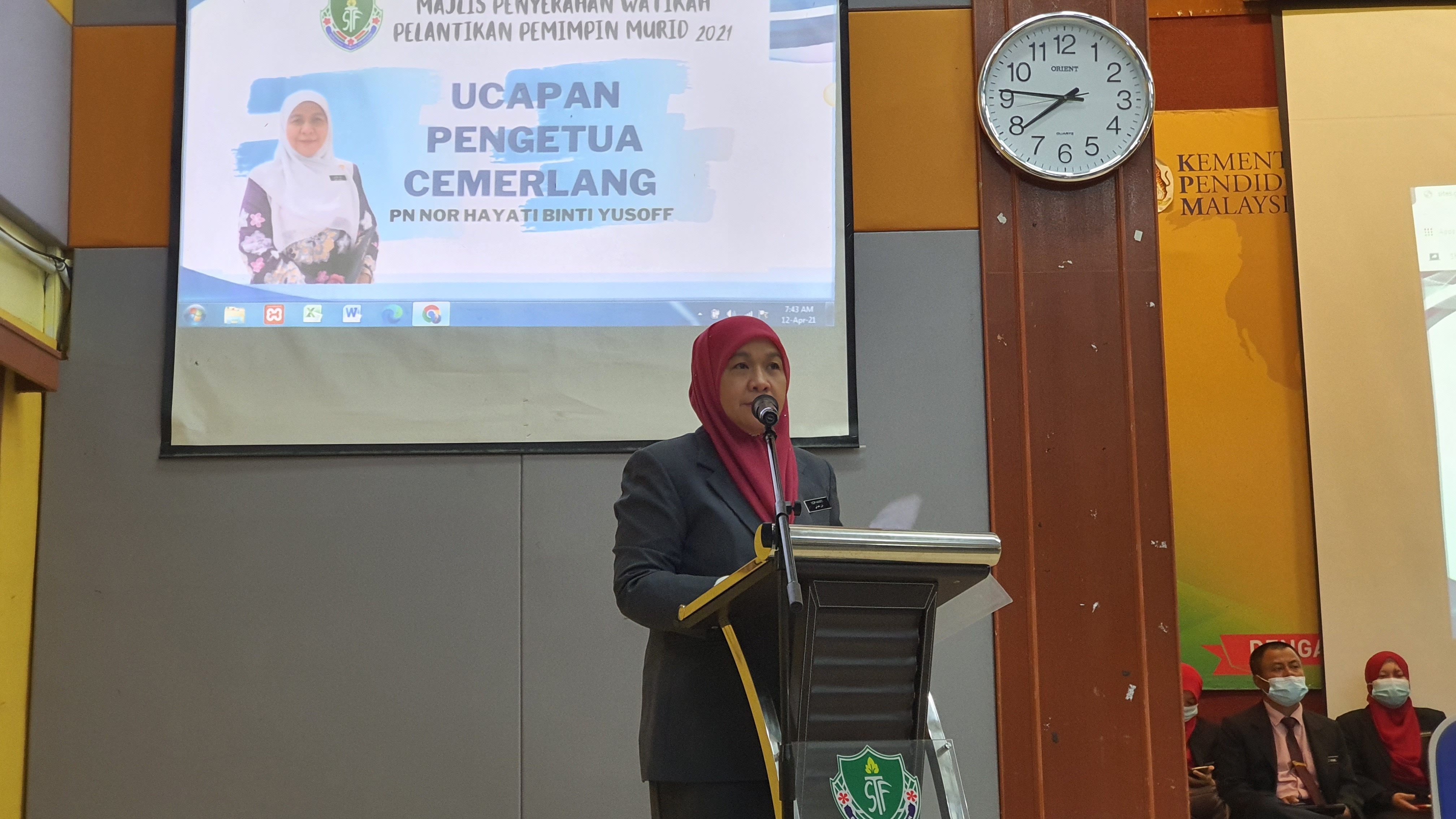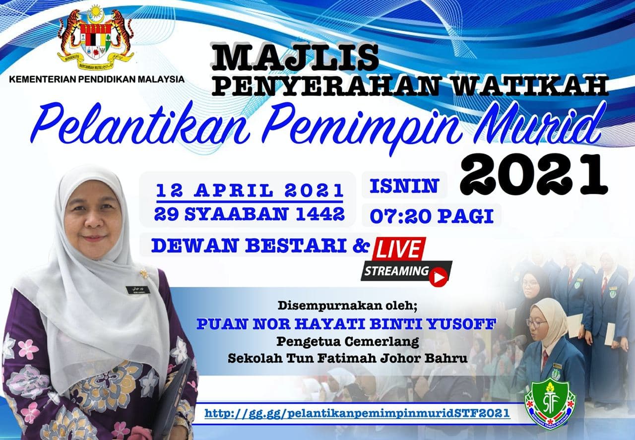 12 April 2021 - Majlis Penyerahan Watikah Pelantikan Pemimpin Murid STF Tahun 2021 berlangsung dengan lancar disempurnakan oleh Ustazah Nor Hayati binti Yusoff, Pengetua Cemerlang Sekolah Tun Fatimah Johor Bahru.