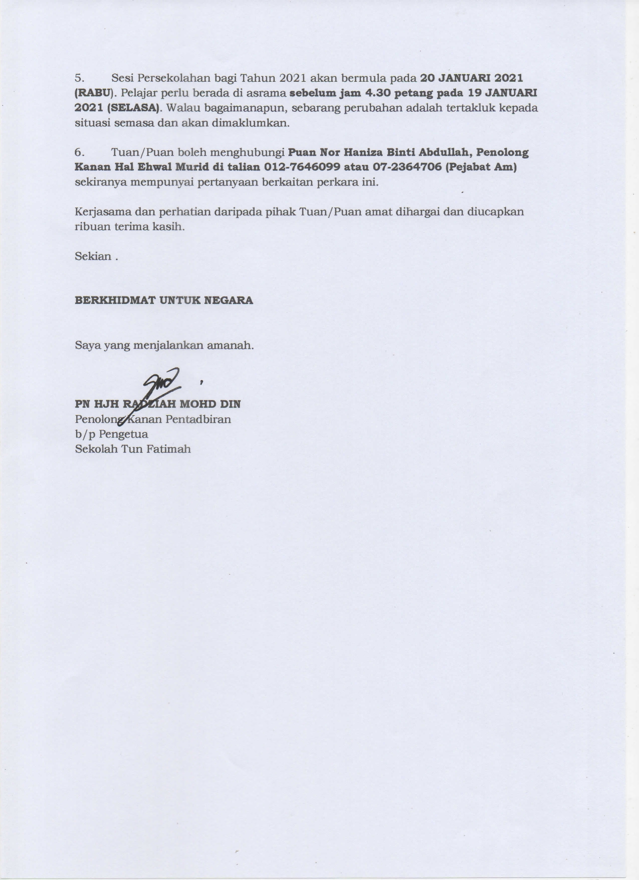 5 Jan. 2021 - Warga STF mengalu-alukan kehadiran Puan Nor Hayati binti Yusoff ke Sekolah Tun Fatimah bagi meneruskan teraju kepimpinan STF ke arah kecemerlangan dan kegemilangan STF di persada dunia pendidikan. Puan Nor Hayati binti Yusoff adalah mantan Pengetua Cemerlang SBP Integrasi Gombak, Selangor.