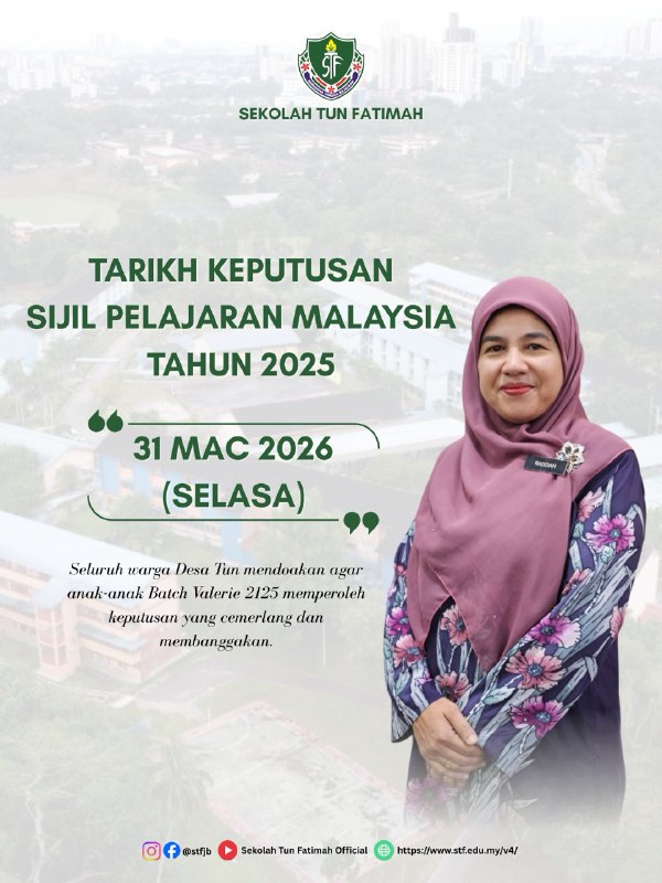 Keputusan Sijil Pelajaran Malaysia (SPM) Tahun 2025 akan diumumkan pada 31 Mac 2026 (Selasa). Seluruh warga sekolah mendoakan agar anak-anak Batch Valerie 2125 memperoleh keputusan yang cemerlang dan membanggakan. Semoga segala usaha dan pengorbanan sepanjang perjalanan ini membuahkan hasil yang terbaik.