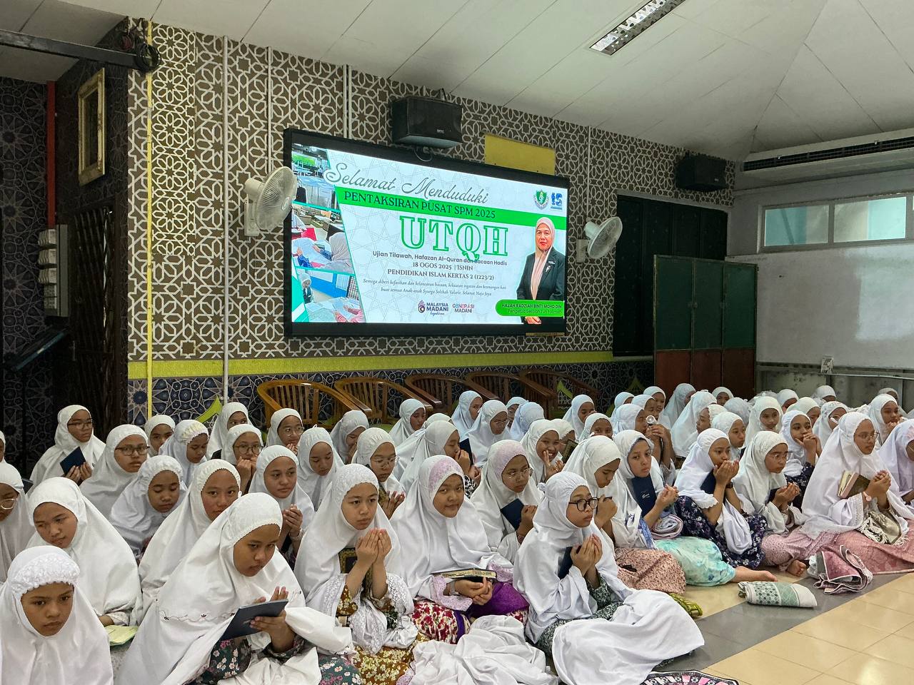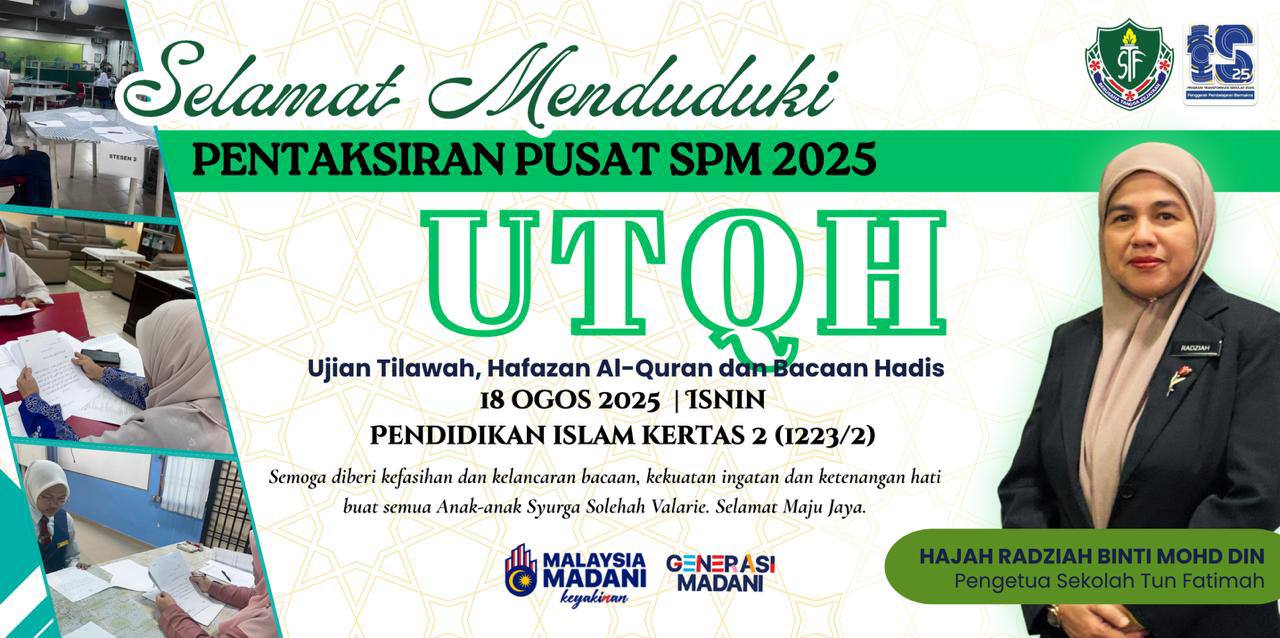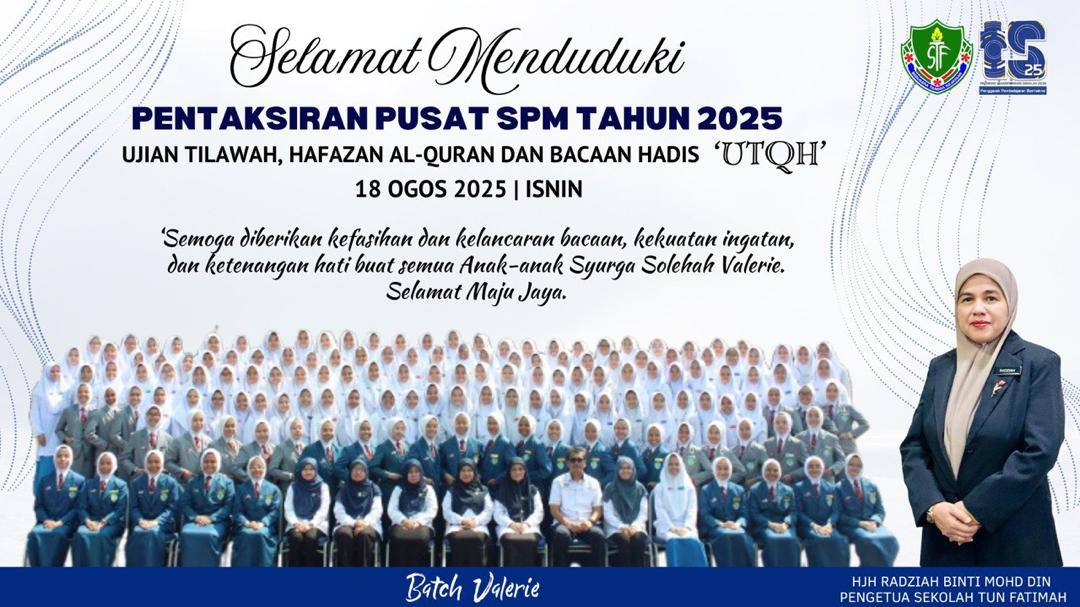 Selamat Maju Jaya Calon SPM (Batch Valarie) 2025 sempena Ujian Tilawah, Hafazan Al-Quran dan Bacaan Hadis (UTQH). Hari ini menjadi detik bersejarah buat seramai 147 calon SPM (Valarie) menduduki Kertas 2 Pendidikan Islam (1223/2) UTQH terus melangkah ke medan perjuangan sebenar dengan kertas pertama sebagai pembuka tirai, semoga setiap usaha, doa dan pengorbanan selama ini menjadi kunci kejayaan.